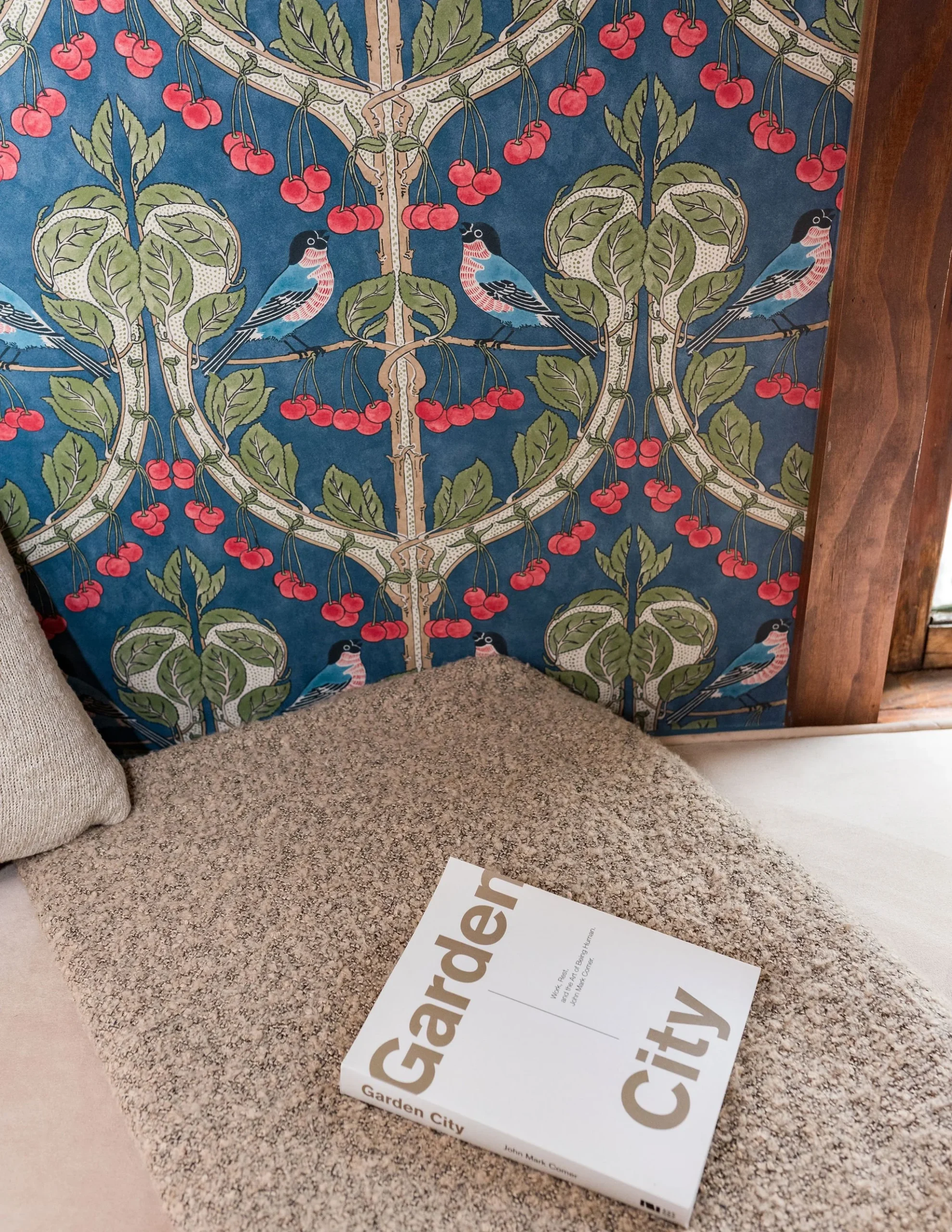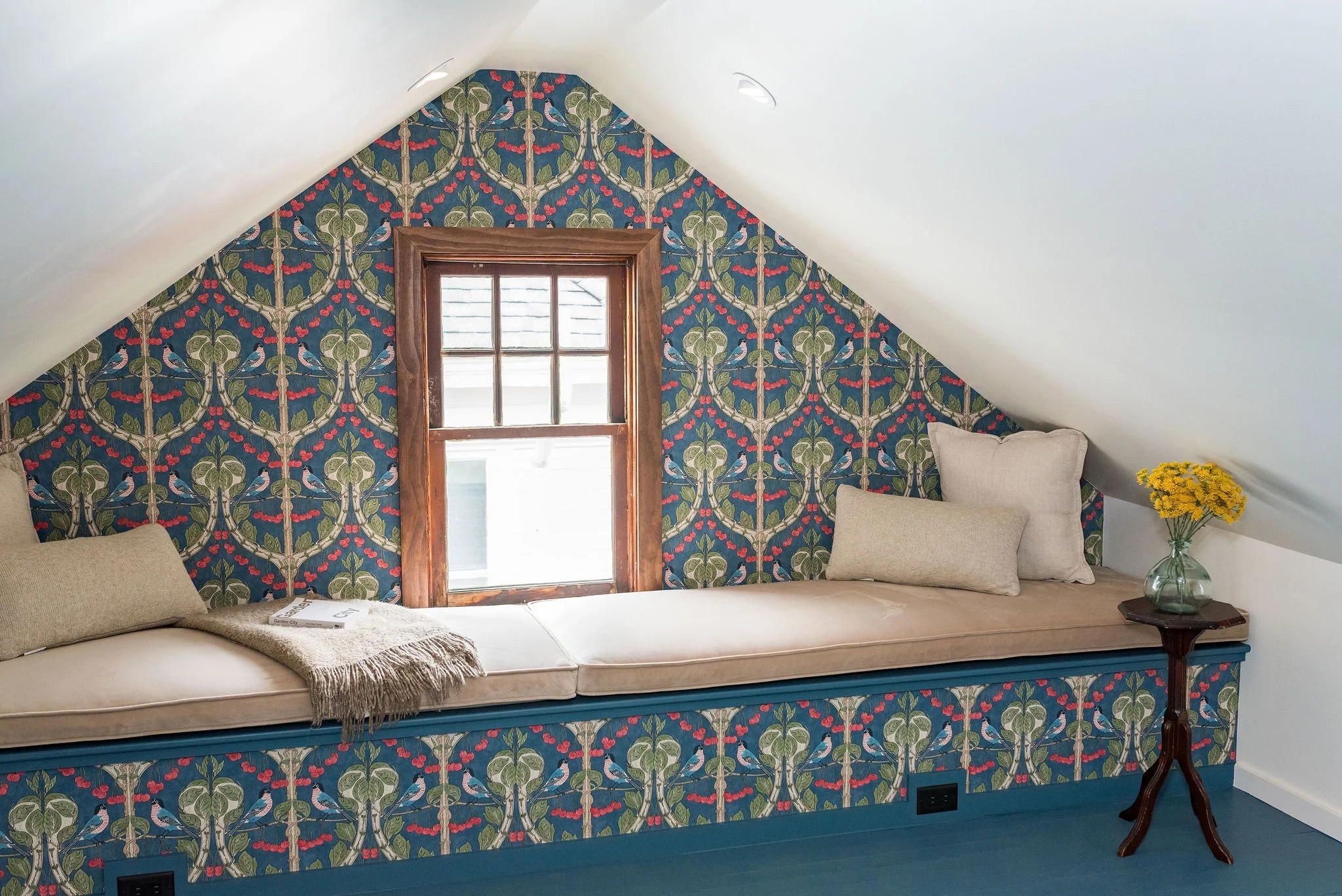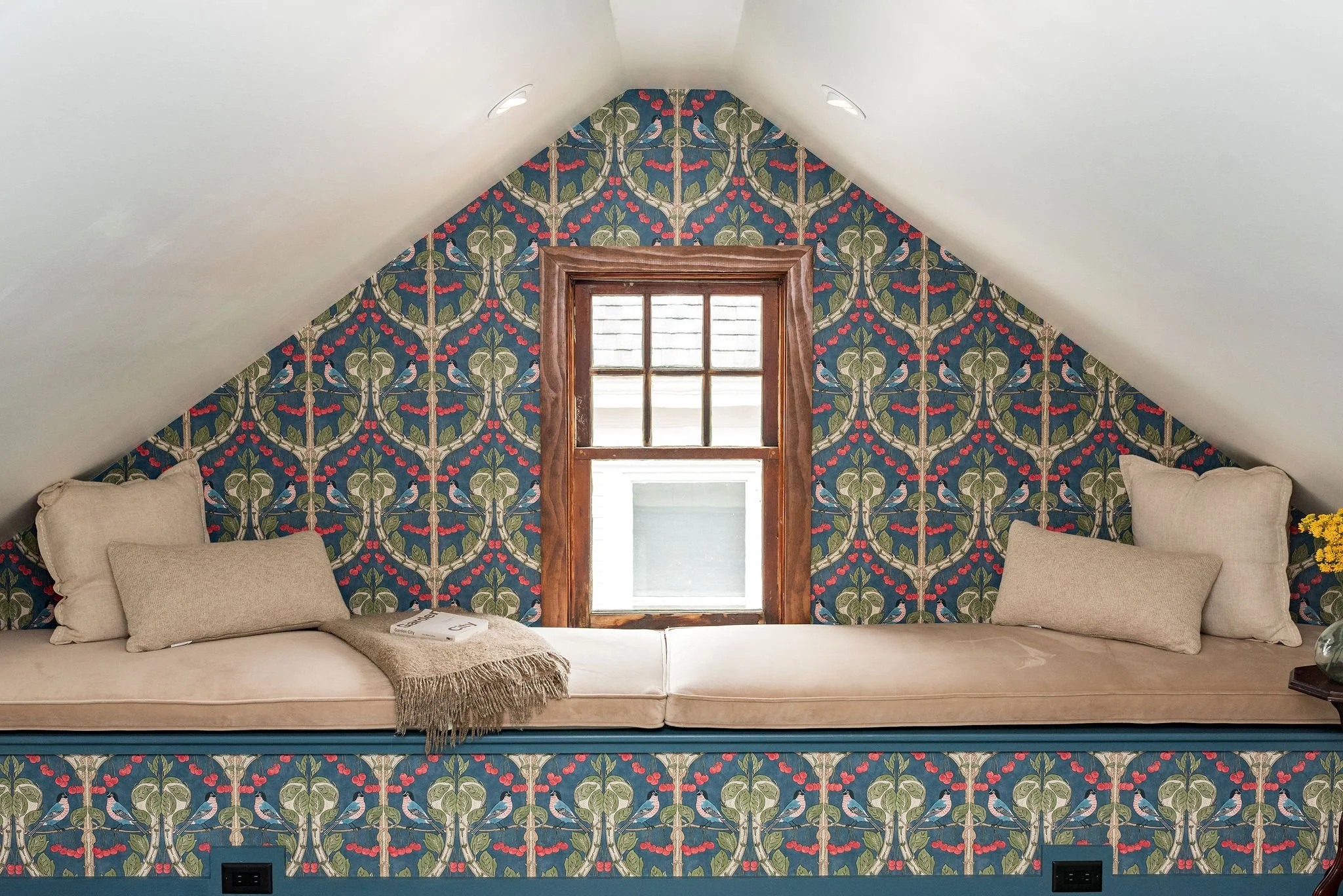 A custom bench cushion, upholstered in high-performance fabric, offers a cozy nook, while the elegant wallpaper by William Morris introduces timeless pattern and texture. This space is a testament to how even the most overlooked areas of a home can become meaningful, beautifully appointed extensions of daily life.