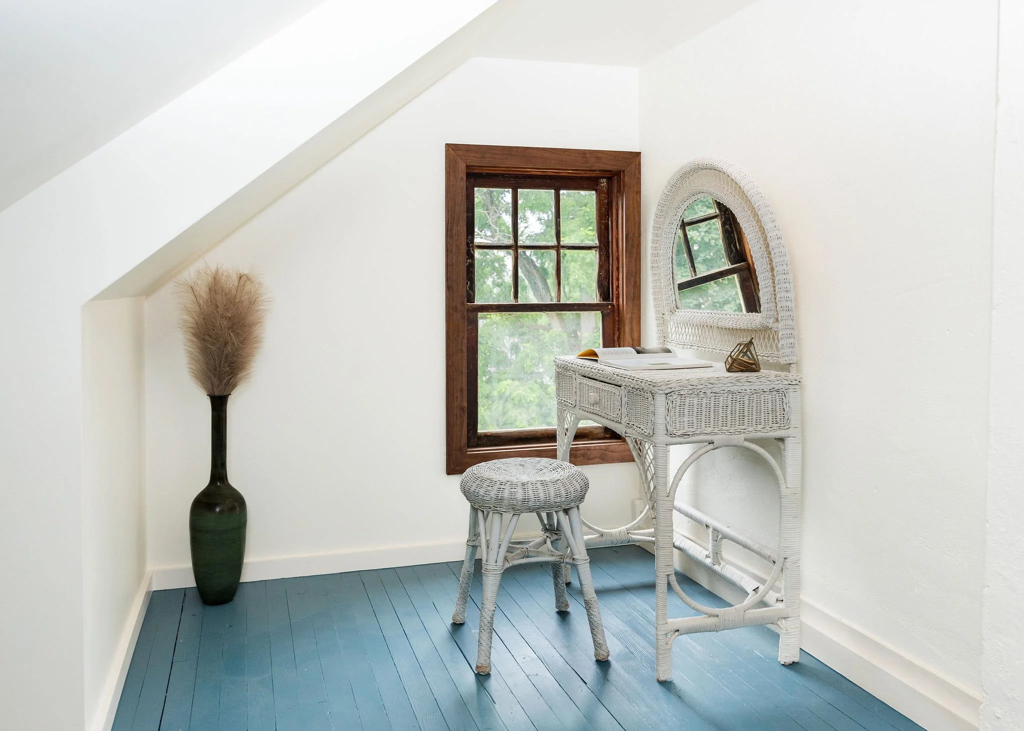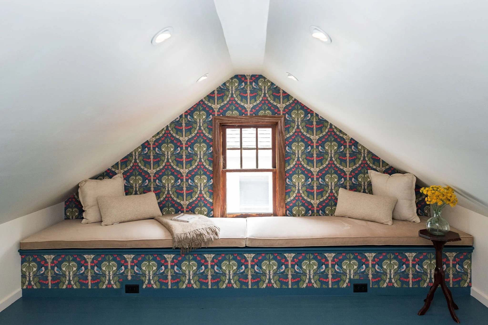 What was once a drafty, unfinished attic in a historic Doylestown duplex has been thoughtfully transformed into a warm, inviting retreat. Designed as a multifunctional home office with space for reading and quiet reflection, the room now balances comfort with utility.