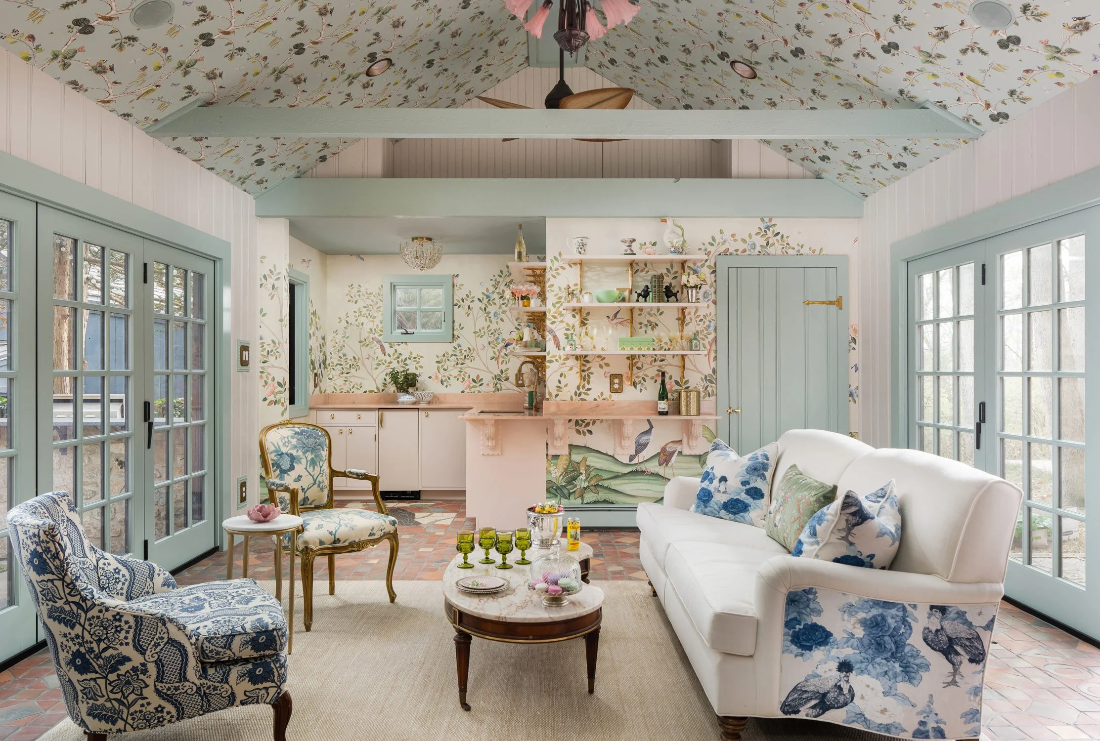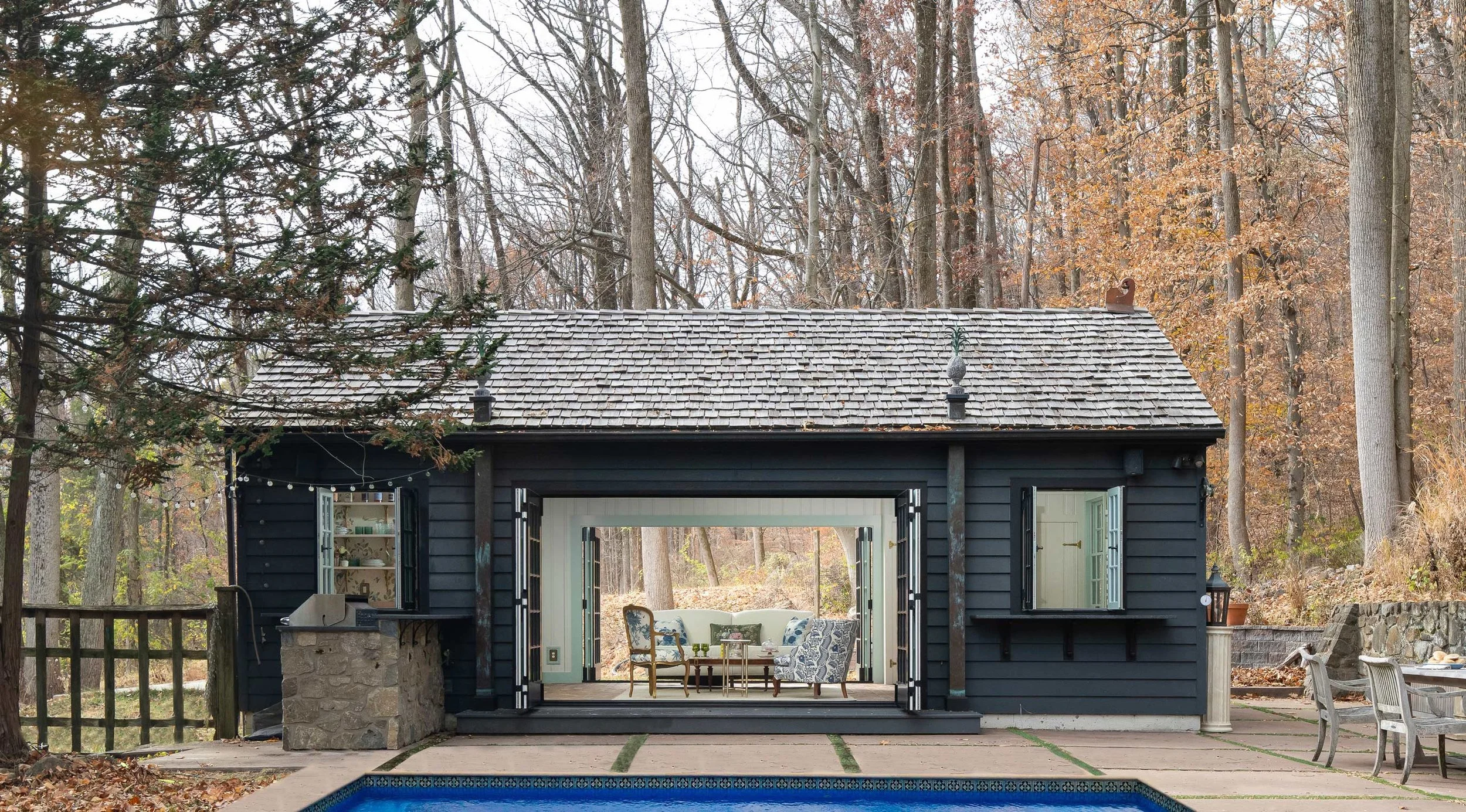 Our Bucks County design-build studio created this elegant pool house for a young, creative couple preparing to start a family. Their vision for their home was clear: they wanted to transform a dark and moody “Sherlock Holmes”-style space into a light-filled, inviting retreat that would be perfect for entertaining friends and future family life. Their love of nature, animals, and eclectic design was the driving inspiration behind this project.
