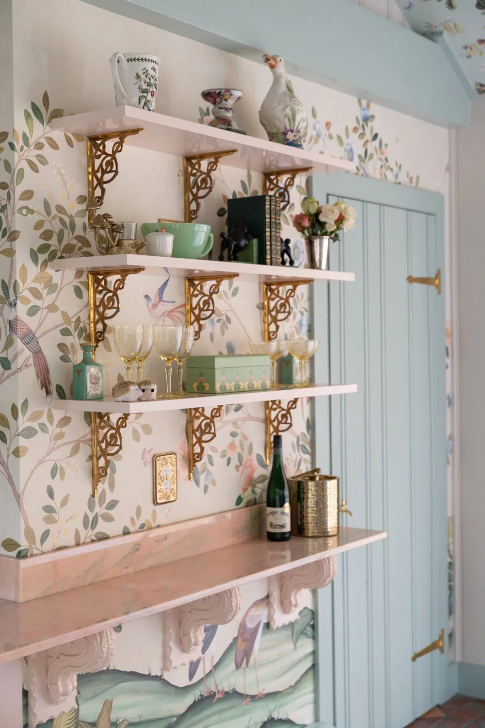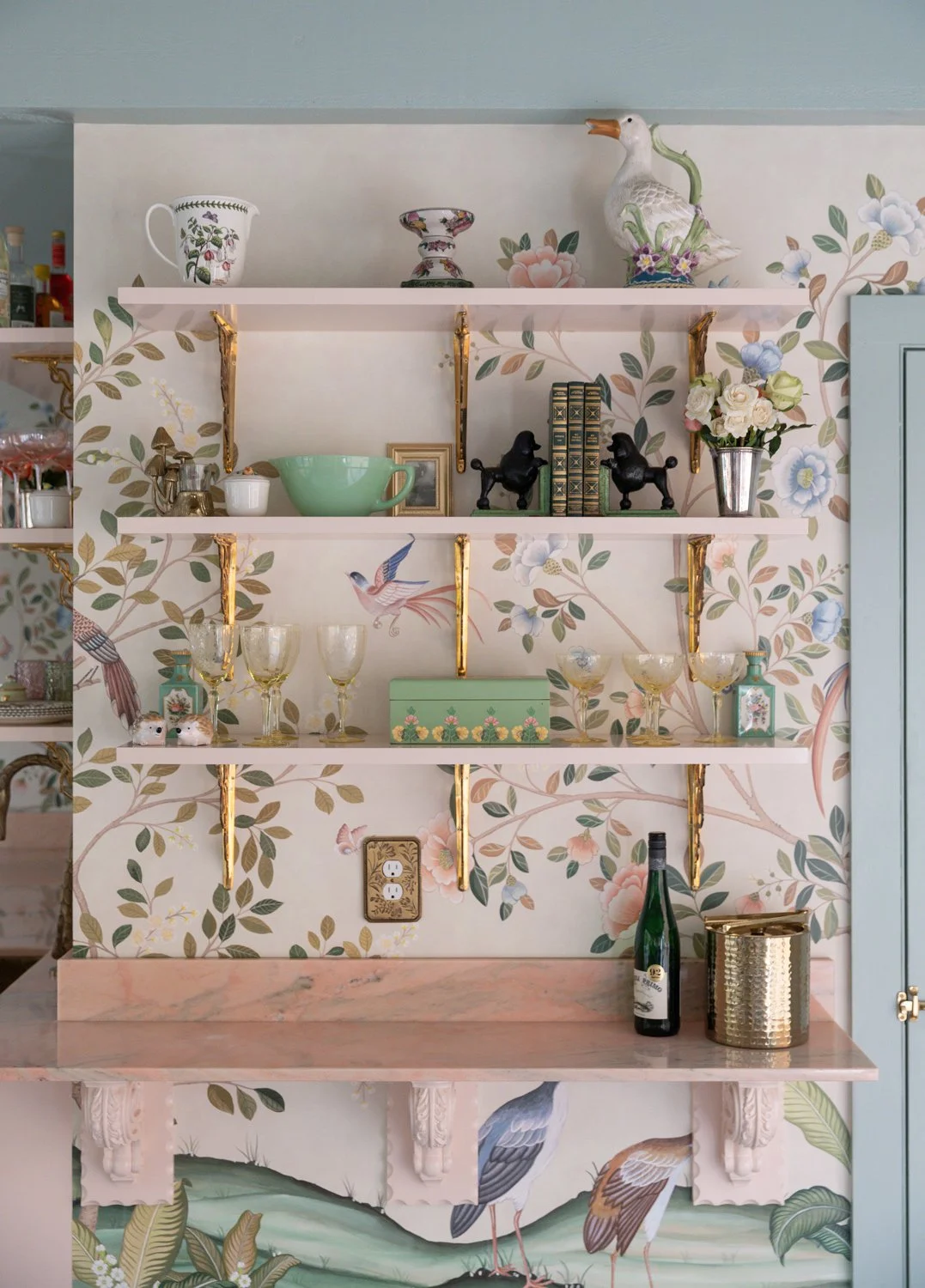 The initial kitchen was tucked away in a separate room and had suffered significant water damage. To create a more functional and inviting space, we removed the wall that divided it from the main area, transforming it into an open, cohesive layout. In the redesigned kitchenette, custom cabinetry and marble countertops elevate the ambience, while intricate details—like a custom-made brass swan faucet—add a distinctive charm, seamlessly blending style and functionality. We also incorporated a groove in the bottom of the shelves to run low-profile LED lighting, casting a soft glow over the kitchen counters and enhancing the overall atmosphere.
