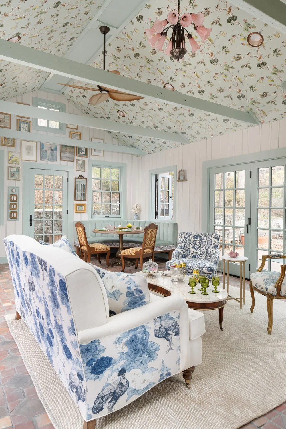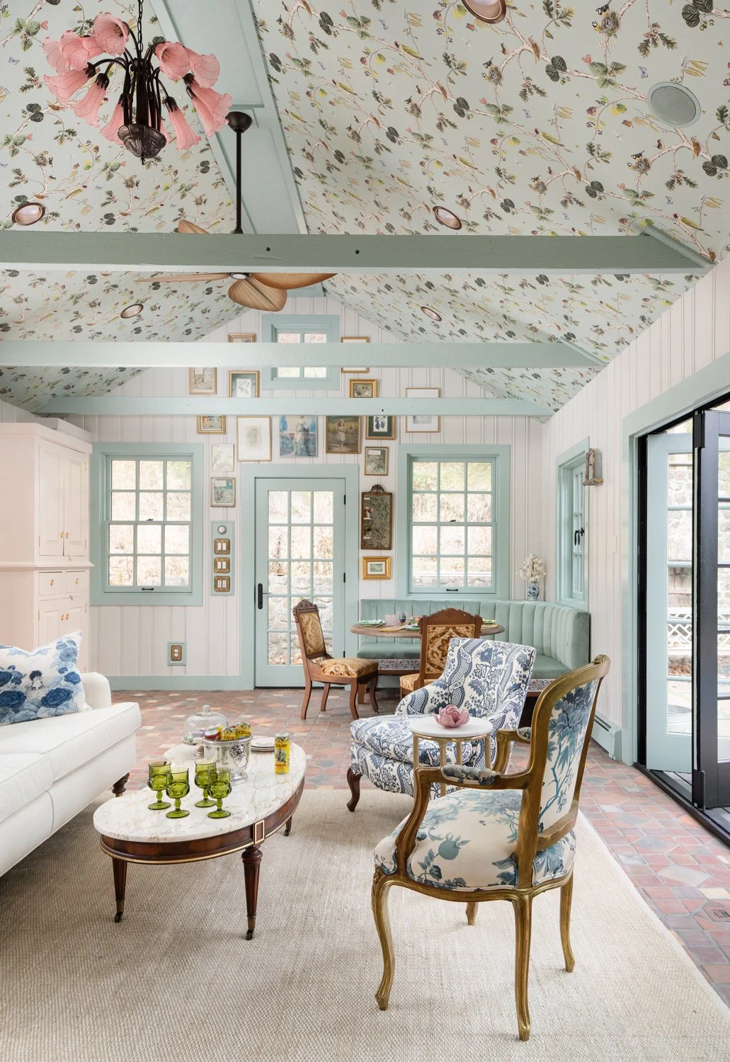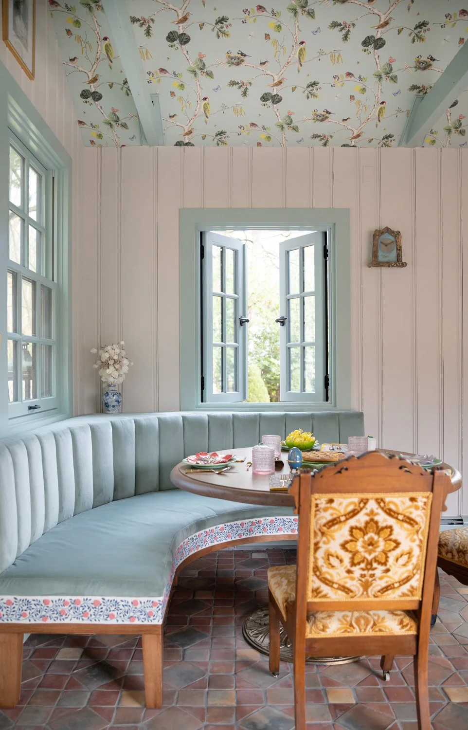 The couple’s playful and maximalist sensibilities guided the design, with a focus on layers of texture, color, and pattern. A pale blue-green and soft pink palette set the tone for a banquette area that feels both serene and lively. The combination of texture and pattern brought the space to life, with upholstered furniture, layered wall and ceiling treatments, and grounding textiles coming together to create a harmonious design.