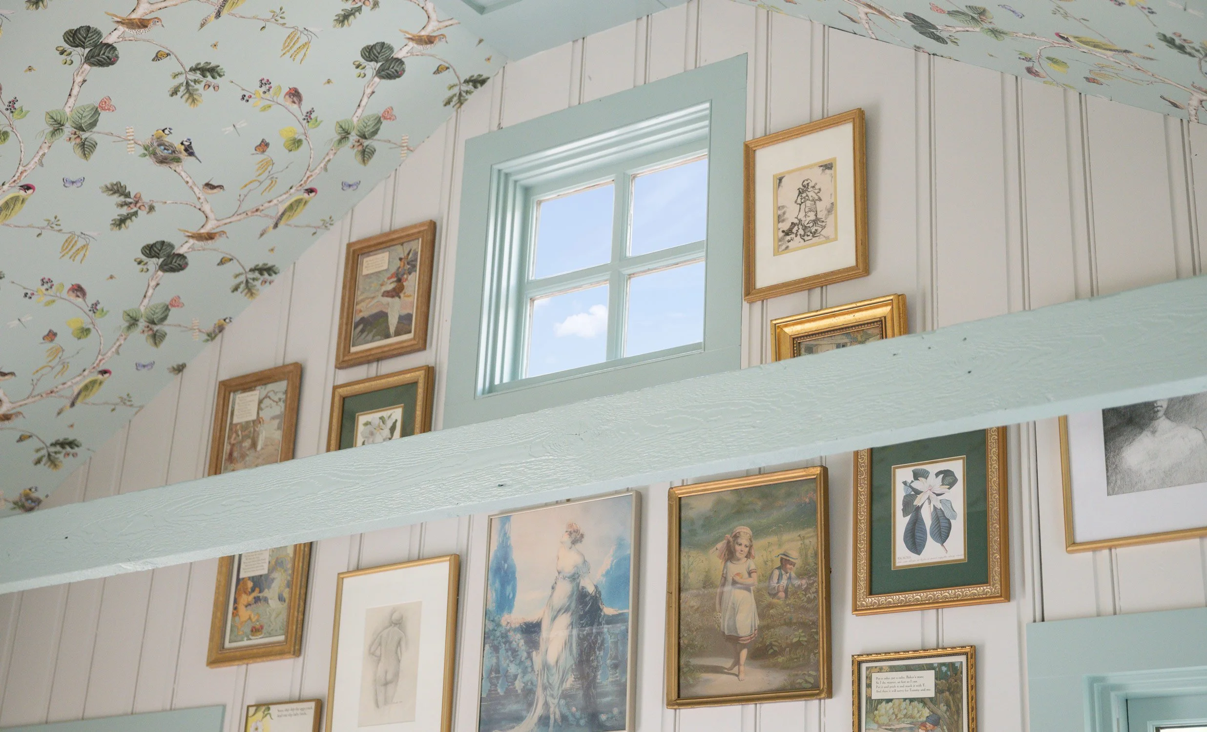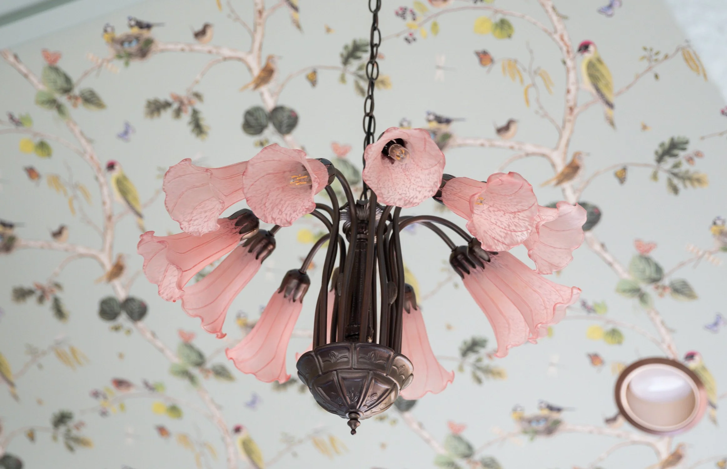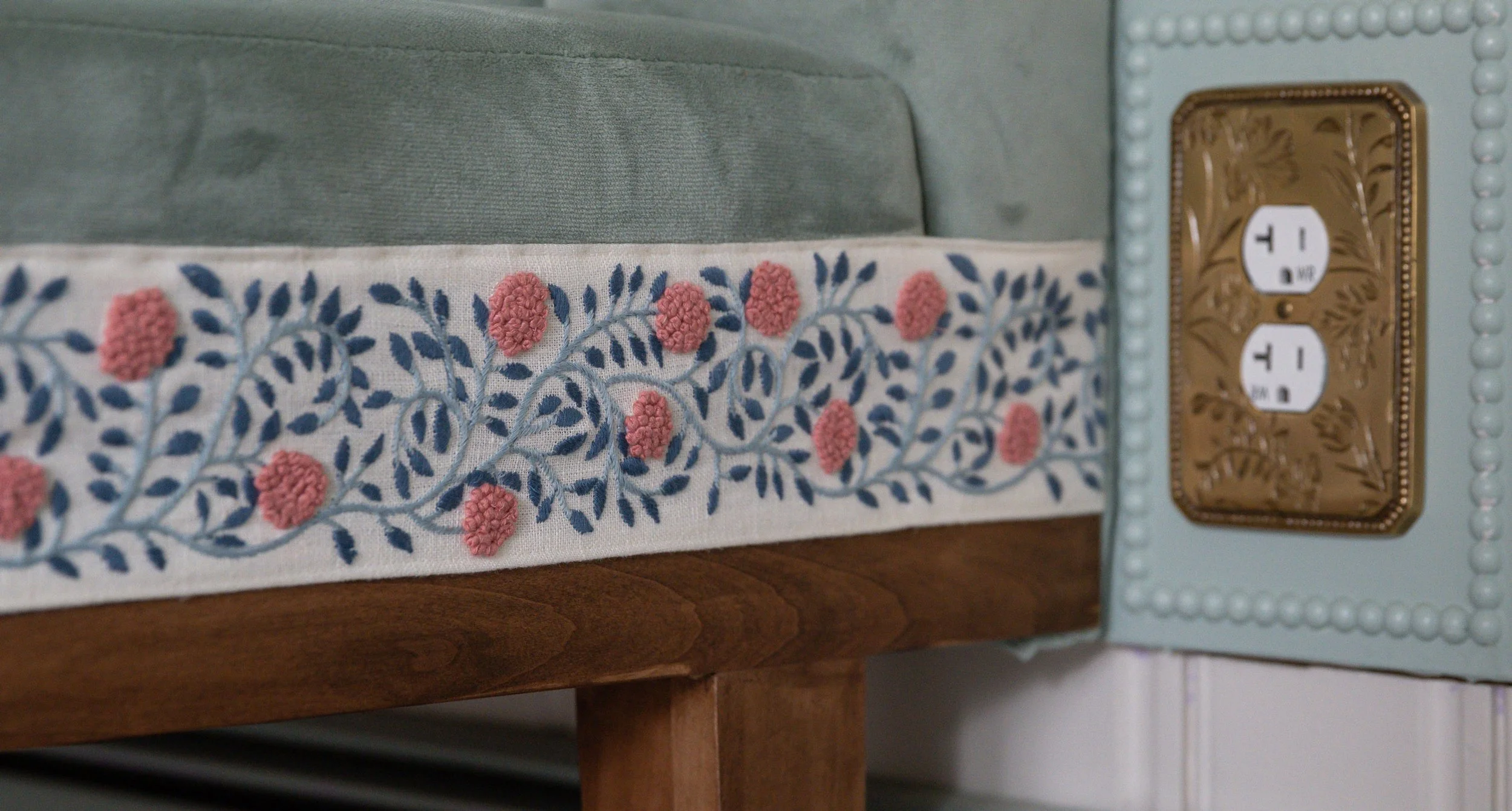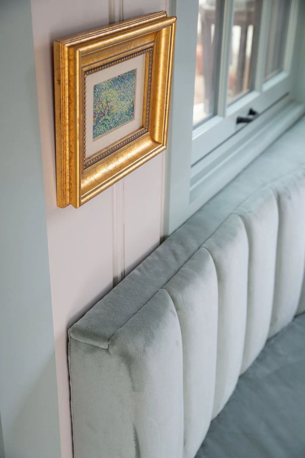The couple’s playful and maximalist sensibilities guided the design, with a focus on layers of texture, color, and pattern. A pale blue-green and soft pink palette set the tone for a banquette area that feels both serene and lively. The combination of texture and pattern brought the space to life, with upholstered furniture, layered wall and ceiling treatments, and grounding textiles coming together to create a harmonious design.