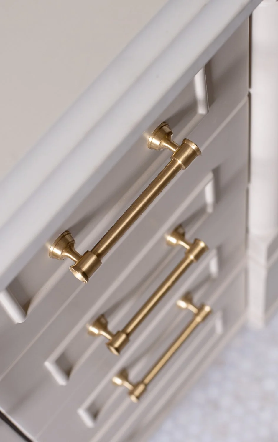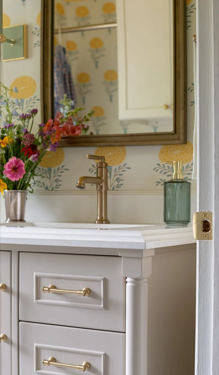 Simple cylindrical brass pulls were chosen for warmth and paired with a single-handle brass faucet. The Baldwin Ellipse privacy door knob with square rose continues the brass story, while a Four Hands Effie mirror in antique brass adds timeless character.
