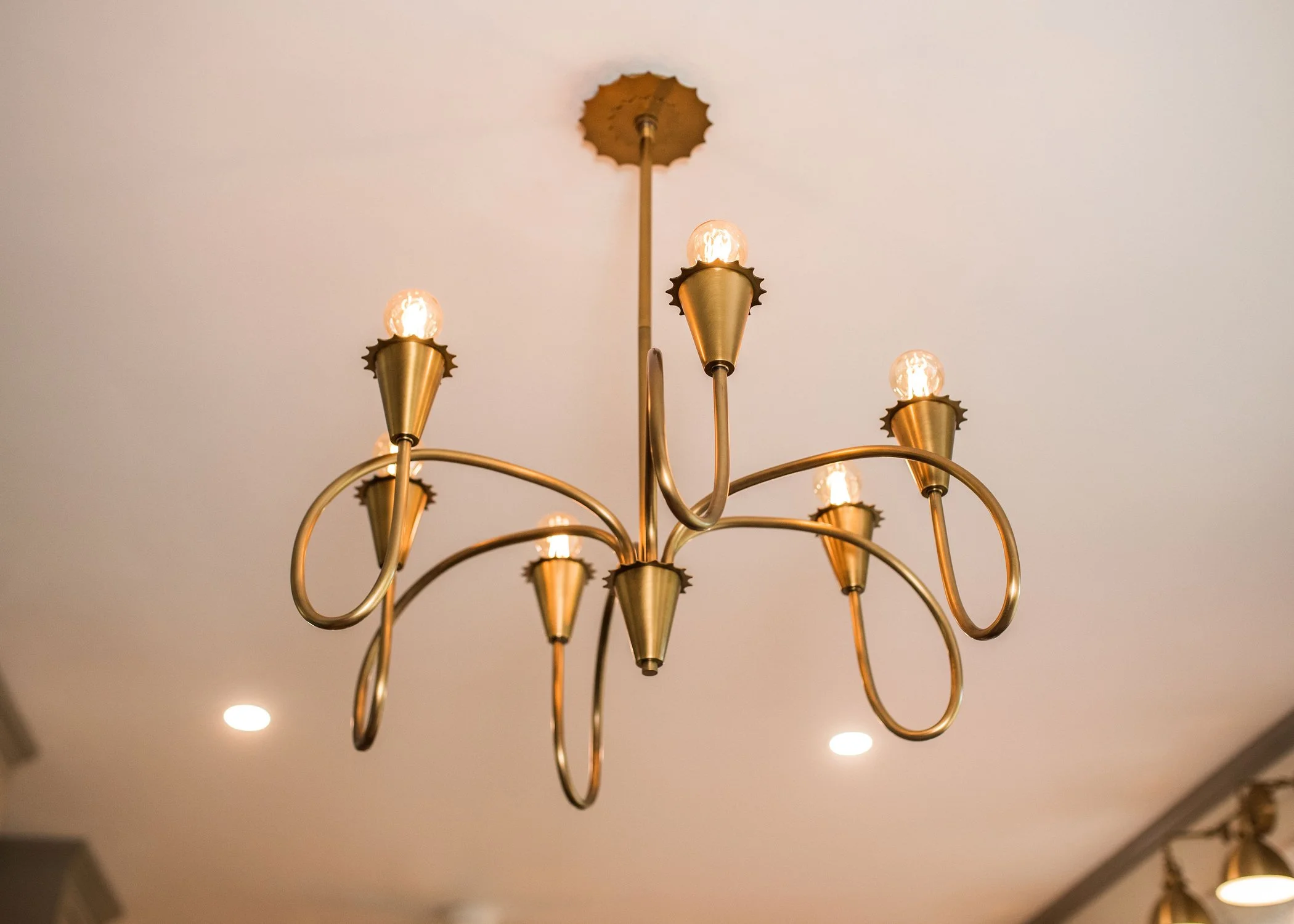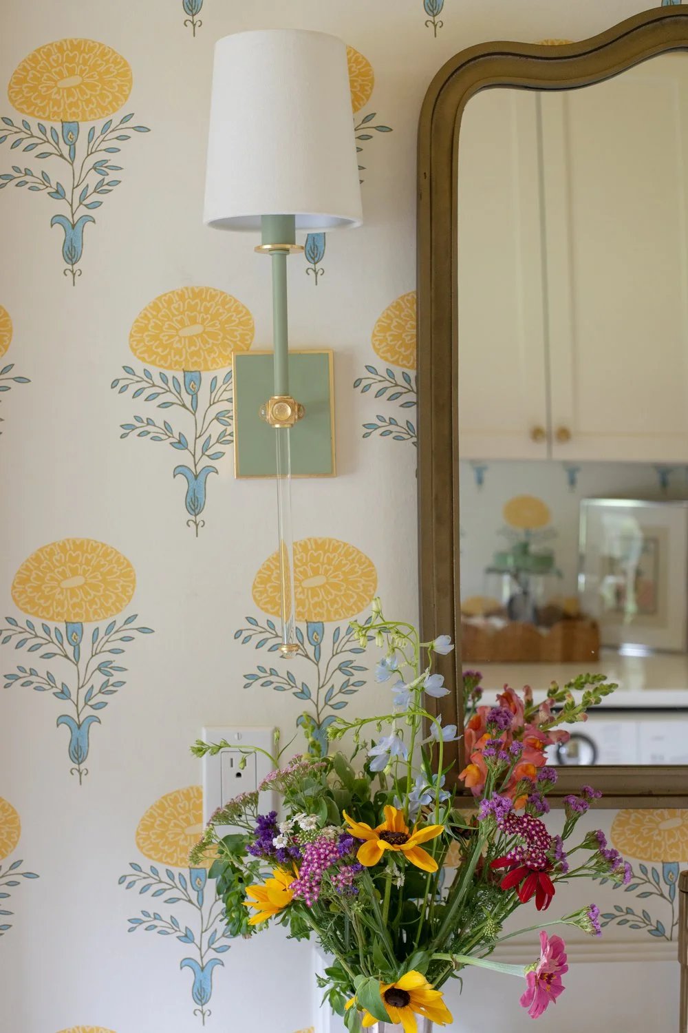Instead of relying on harsh overhead light, we layered in Visual Comfort’s Lucia Tail Sconce in celadon and crystal. Its pale green tone introduces a soft accent against the wallpaper’s golden blooms.