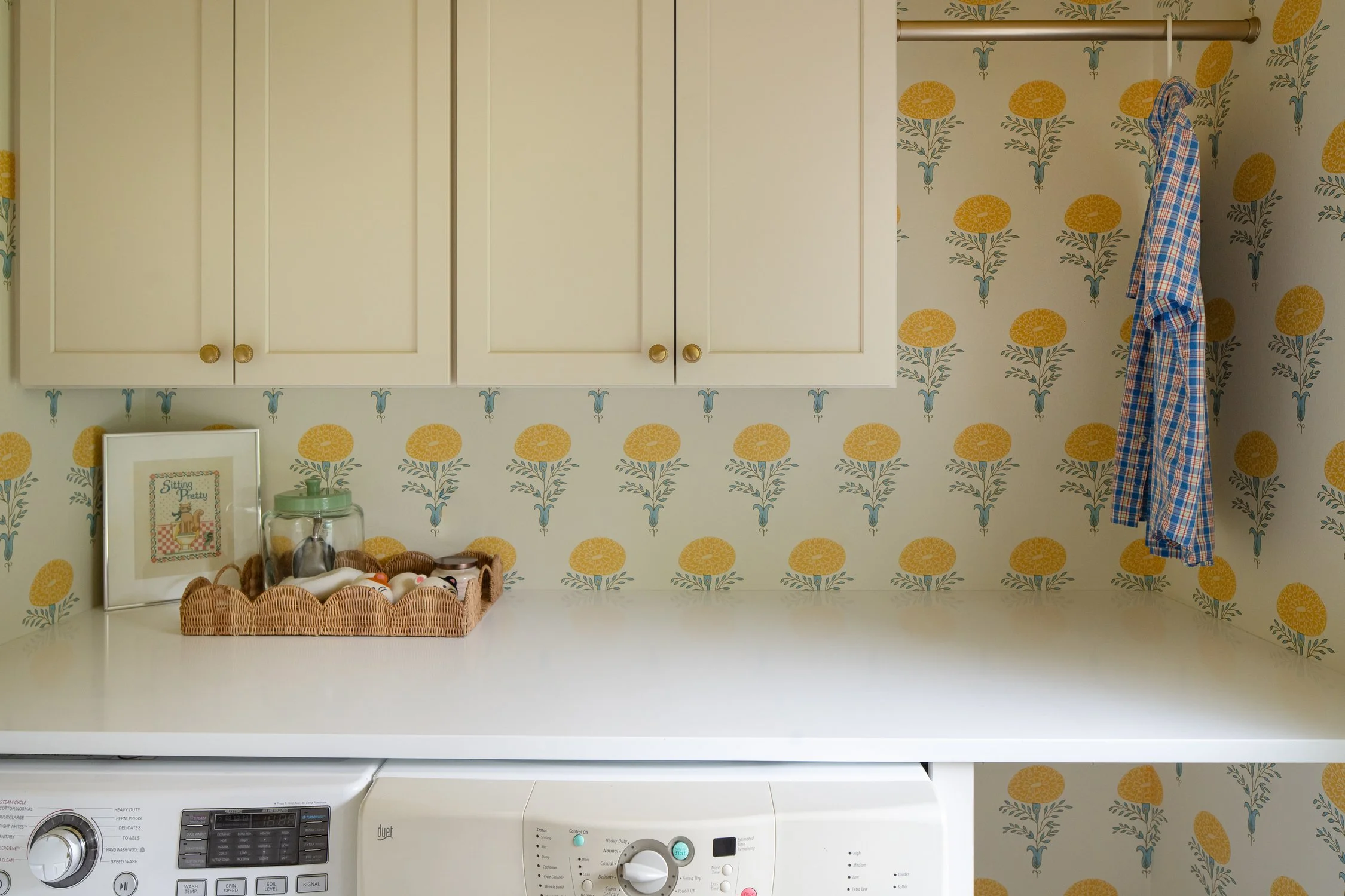 Cream-toned shaker cabinets with brass knobs provide ample storage, while a wall-to-wall quartz counter above the washer and dryer offers room for folding and organizing. Schumacher’s “Marigold” wallpaper in yellow—designed in collaboration with Molly Mahon—ties the laundry visually to the adjoining bath, making the entire suite feel intentional and uplifting.