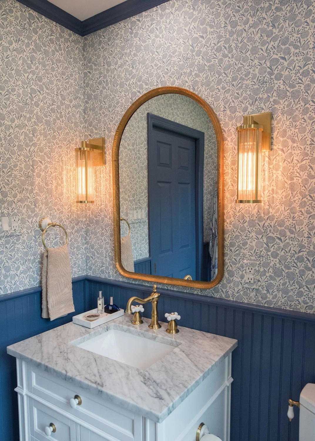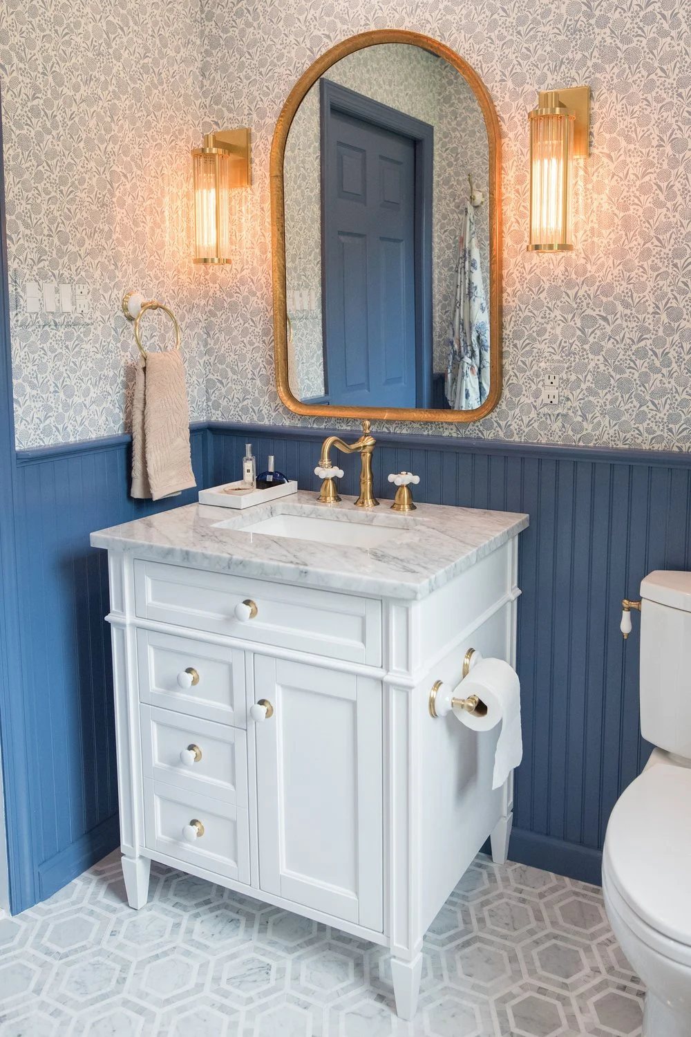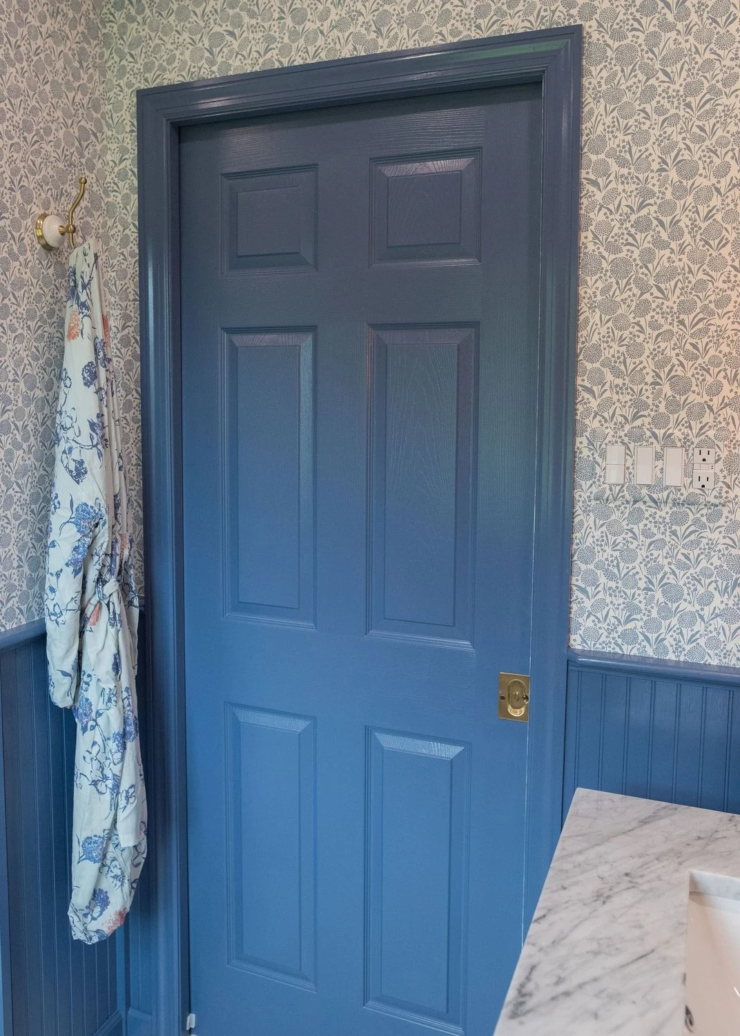 The existing guest bathroom was both outdated and compromised by a hidden leak. Inspired by the vibrant blues of the classic wallpaper the clients loved, we infused the room with color while ensuring every element served a purpose. Marble surfaces and aged brass accents add timeless richness, while the blue motif ties together the palette.