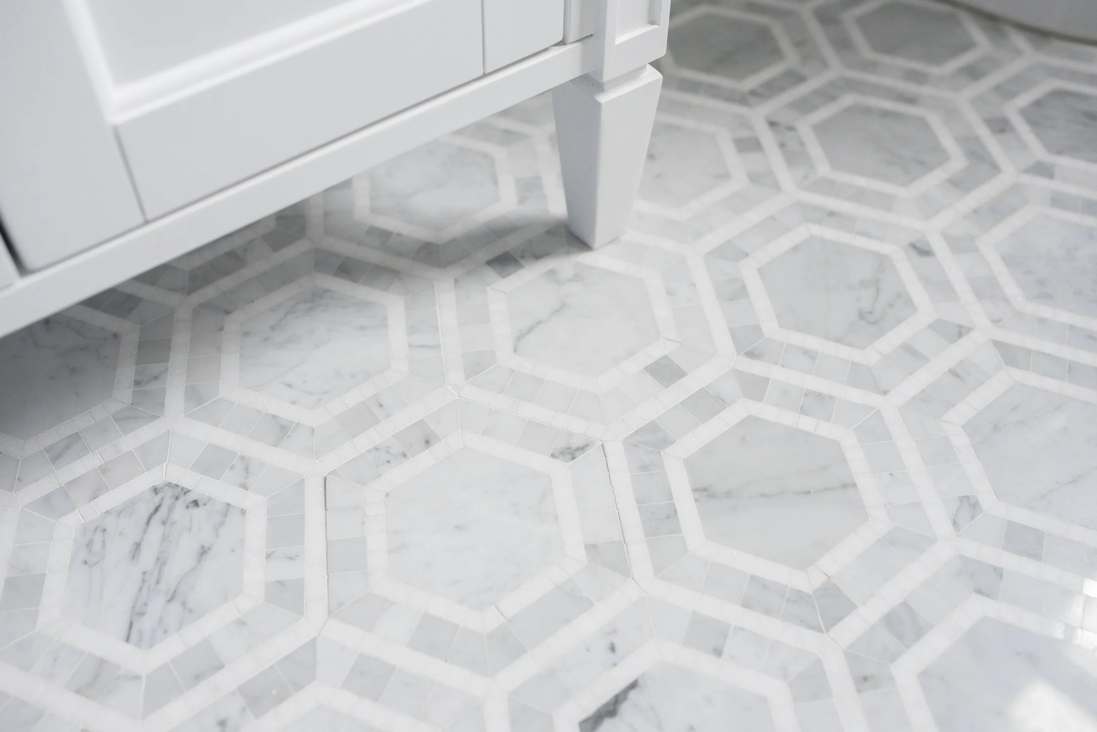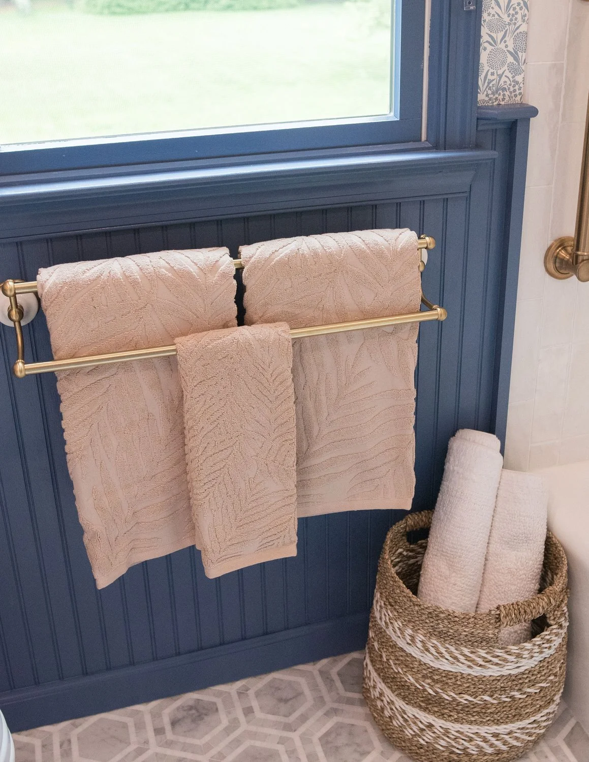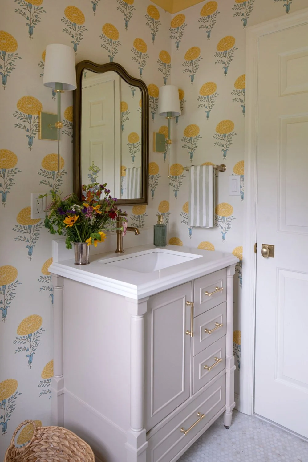 The old vanity was replaced with a Willow Bath & Vanity Aberdeen cabinet in a soft taupe finish, topped with a clean white counter. Hex marble mosaic tile grounds the space, while a woven basket softens the transition between vanity and toilet, adding everyday storage. With wallpaper wrapping every wall and the ceiling painted in a coordinating golden tone, the small room feels both cozy and elevated.