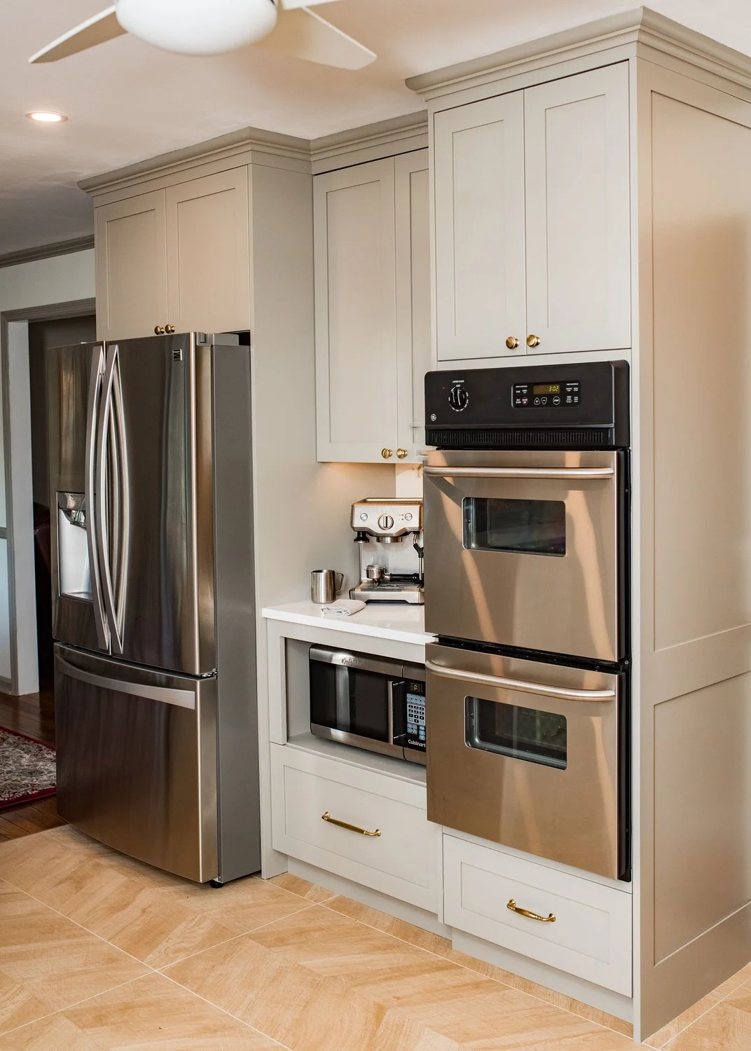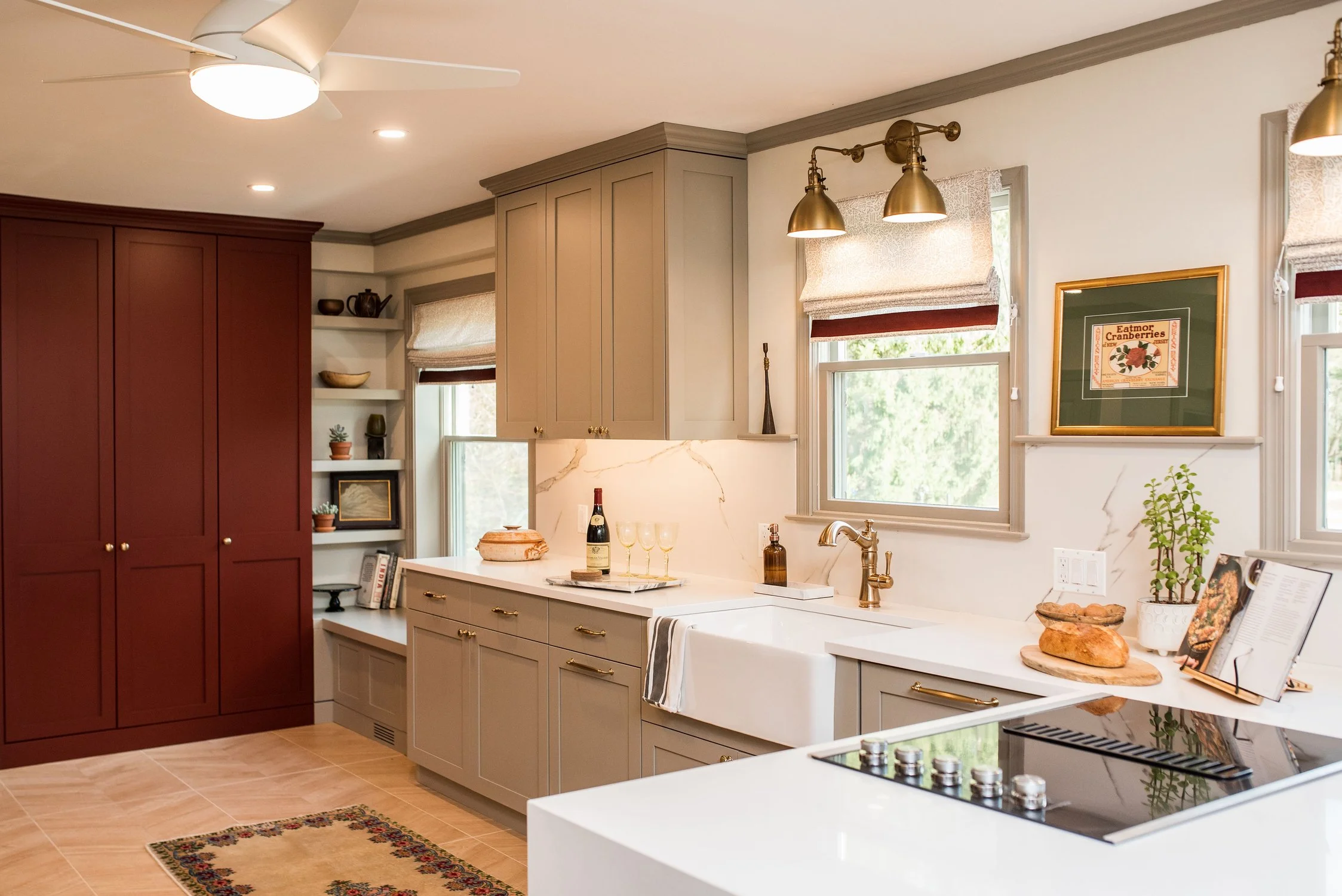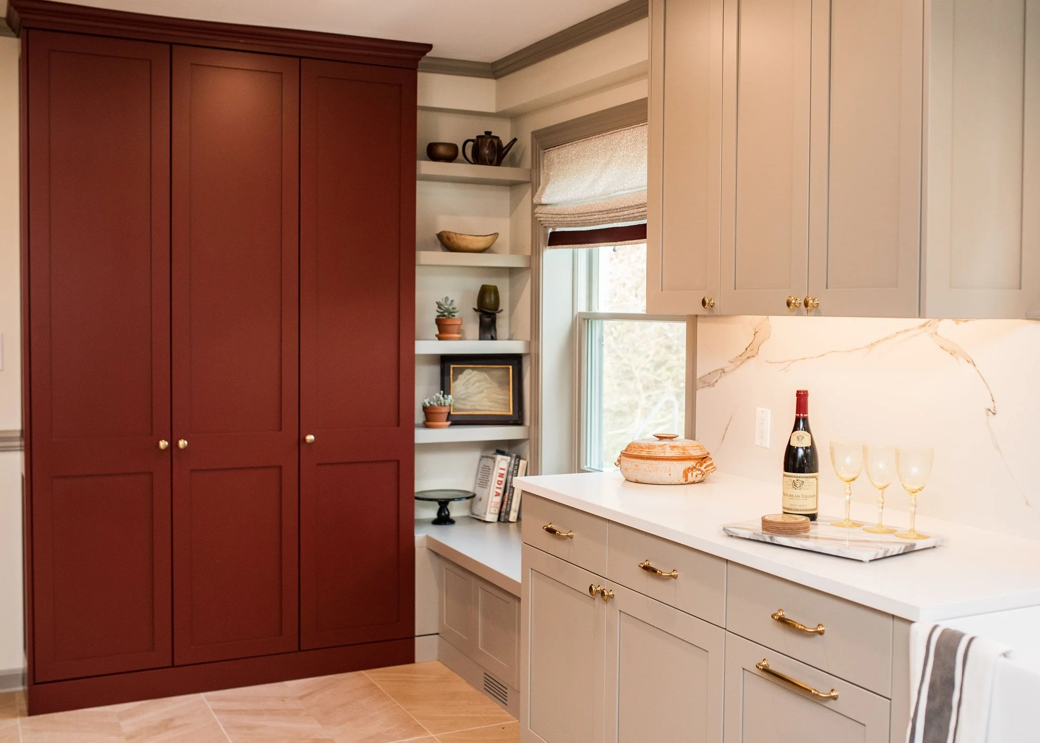 The homeowners were drawn to a rich cranberry hue, and our design wove that preference into the space with care and restraint. Custom window treatments and a floor-to-ceiling pantry highlight the color in a balanced, intentional way. Open shelving and a chair rail detail along the backsplash add warmth, function, and a touch of personalization. This transformation is among our favorites—not only for its aesthetic impact, but for the way the space now supports the rhythms of daily life with grace and ease.