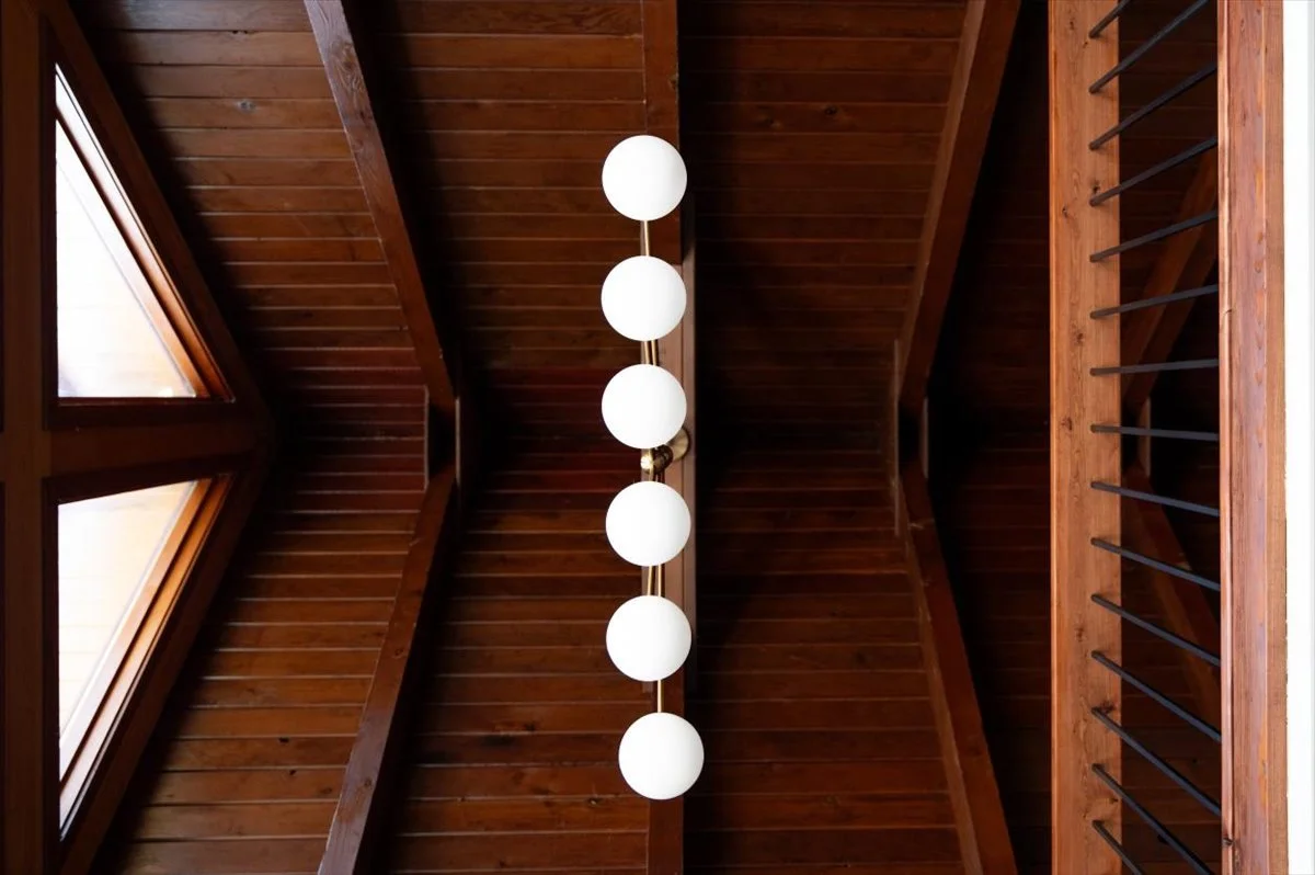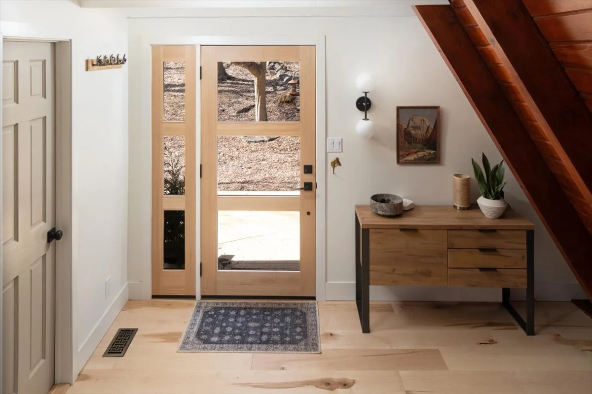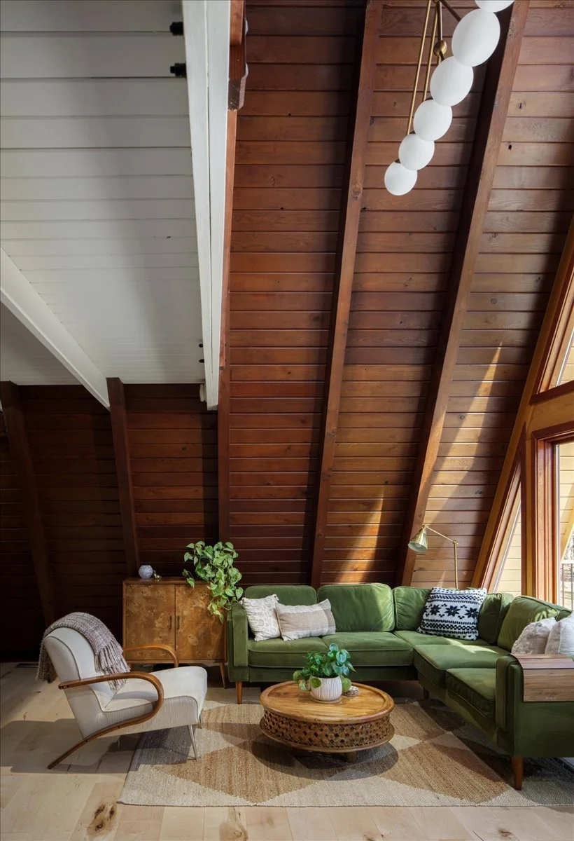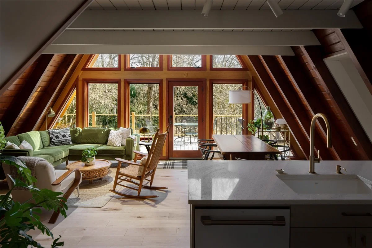 A-frame architecture is known for its dramatic walls of windows that invite natural light and outdoor views inside. To further emphasize that connection, we made a bold change to the flooring. The original large, square off-white tiles didn’t reflect our clients’ style or enhance the natural palette of the home. In their place, we installed light maple engineered hardwood flooring by Mirage Floors, offering a softer, warmer, and more organic surface that beautifully reflects the surrounding light.