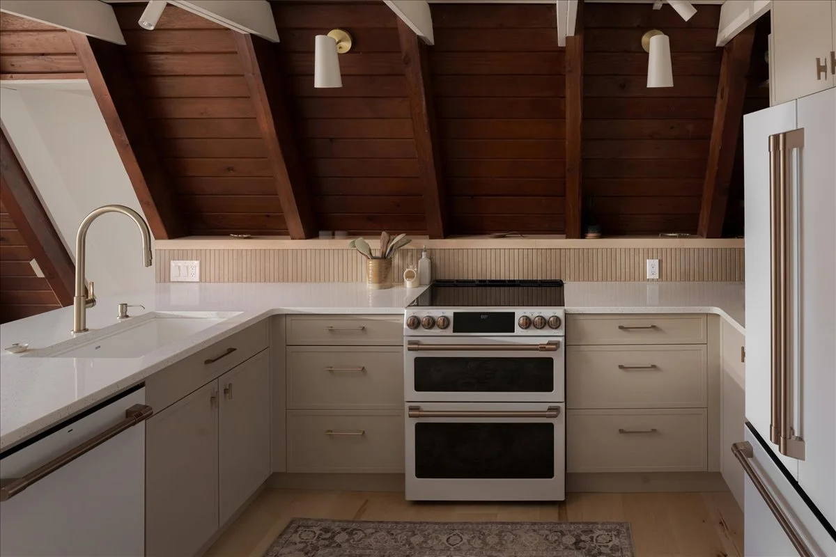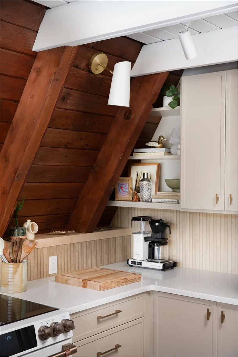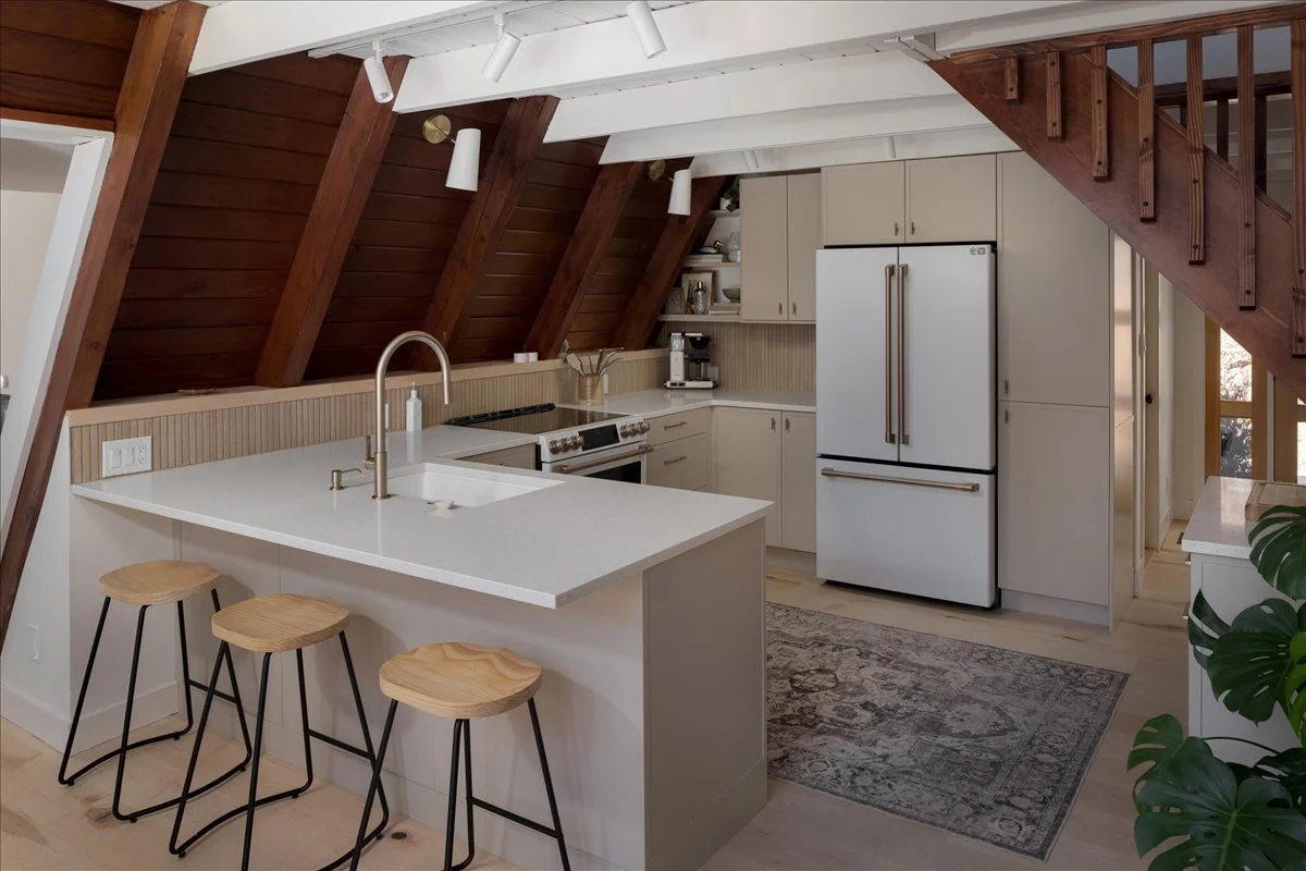 The kitchen served as the primary focus of this A-frame renovation. Our clients—a kind couple who had recently relocated from the city—were immediately drawn to the charm and potential of the home. However, the original kitchen was not meeting their needs. The space felt closed off and dark, and the countertop sat directly against the angled wall, significantly reducing headroom—especially challenging for one of our taller clients.