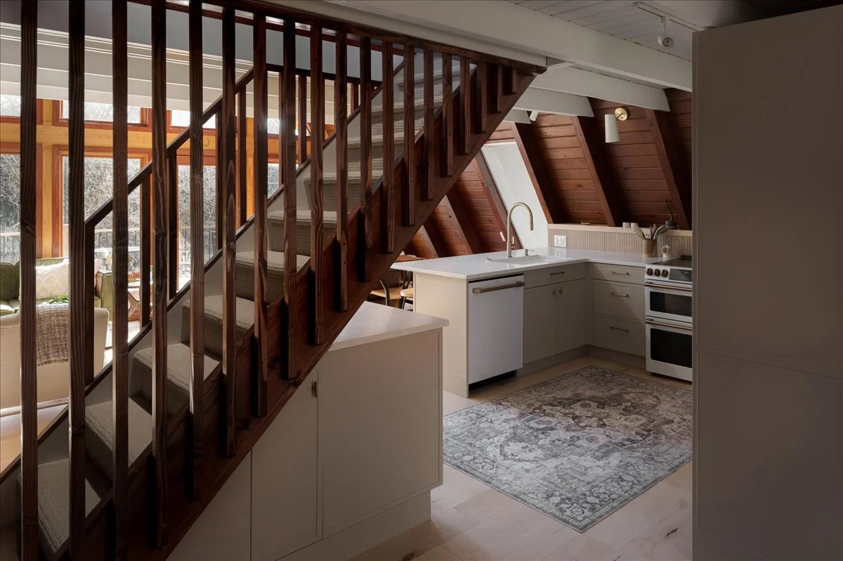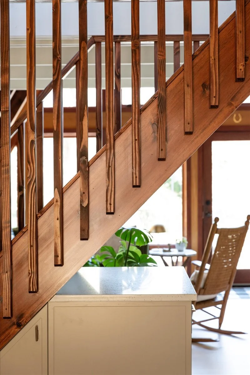 To complete the transformation, we replaced the enclosed stairway walls with custom slat walls and railings, carefully stained to match the existing decking throughout the home. This change not only introduced architectural continuity but also allowed for increased countertop space and additional storage in the kitchen—bringing both beauty and practicality to the heart of the home.