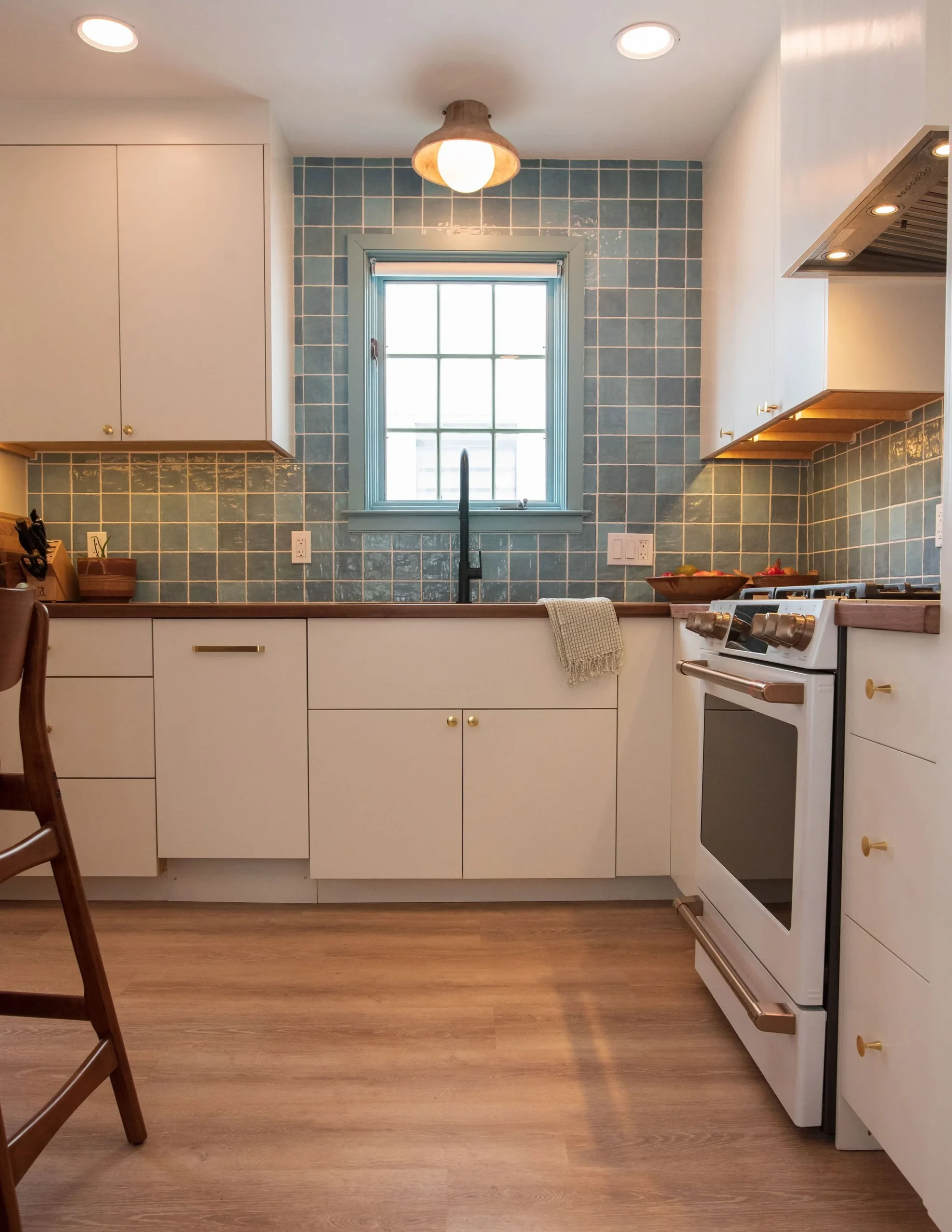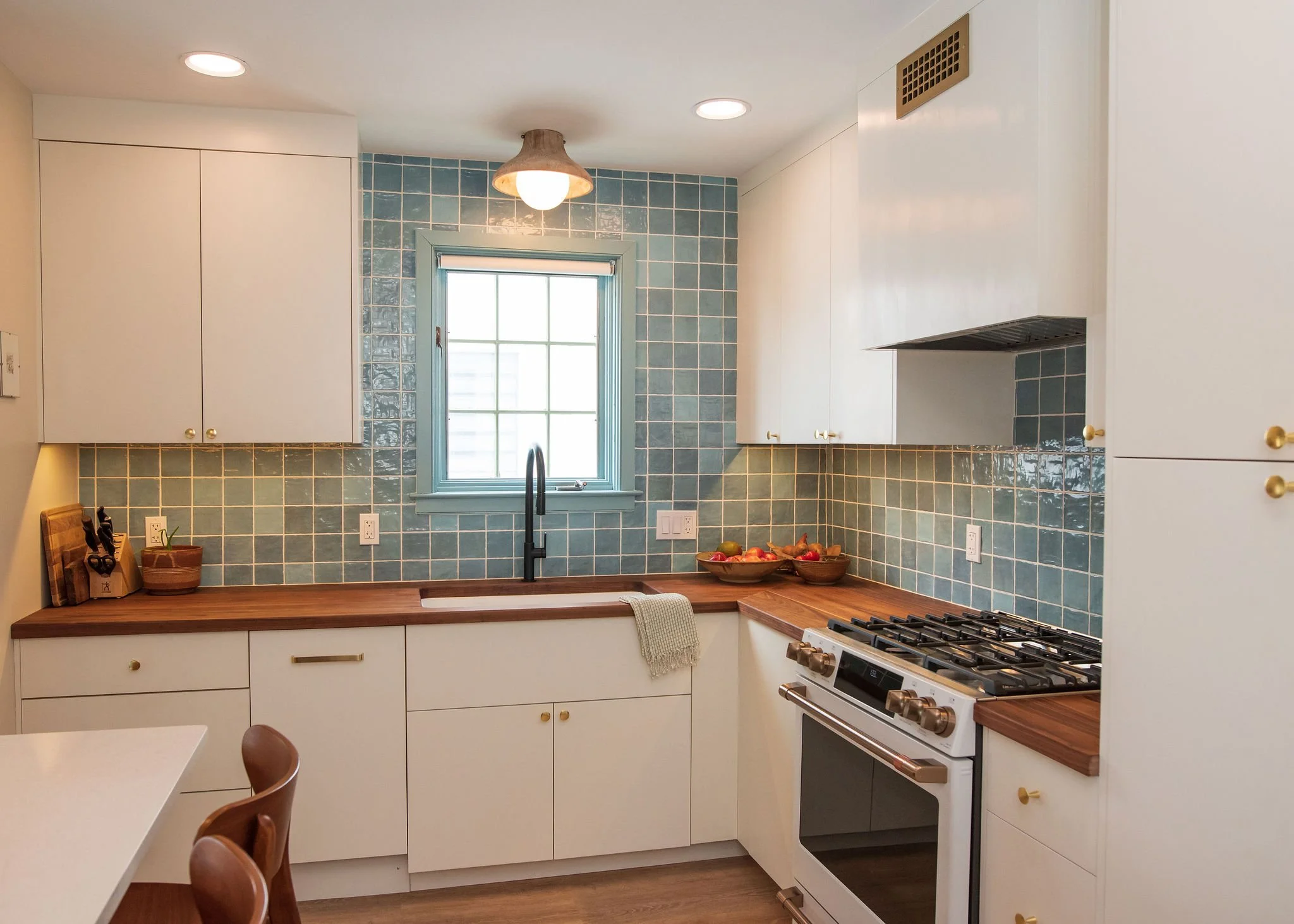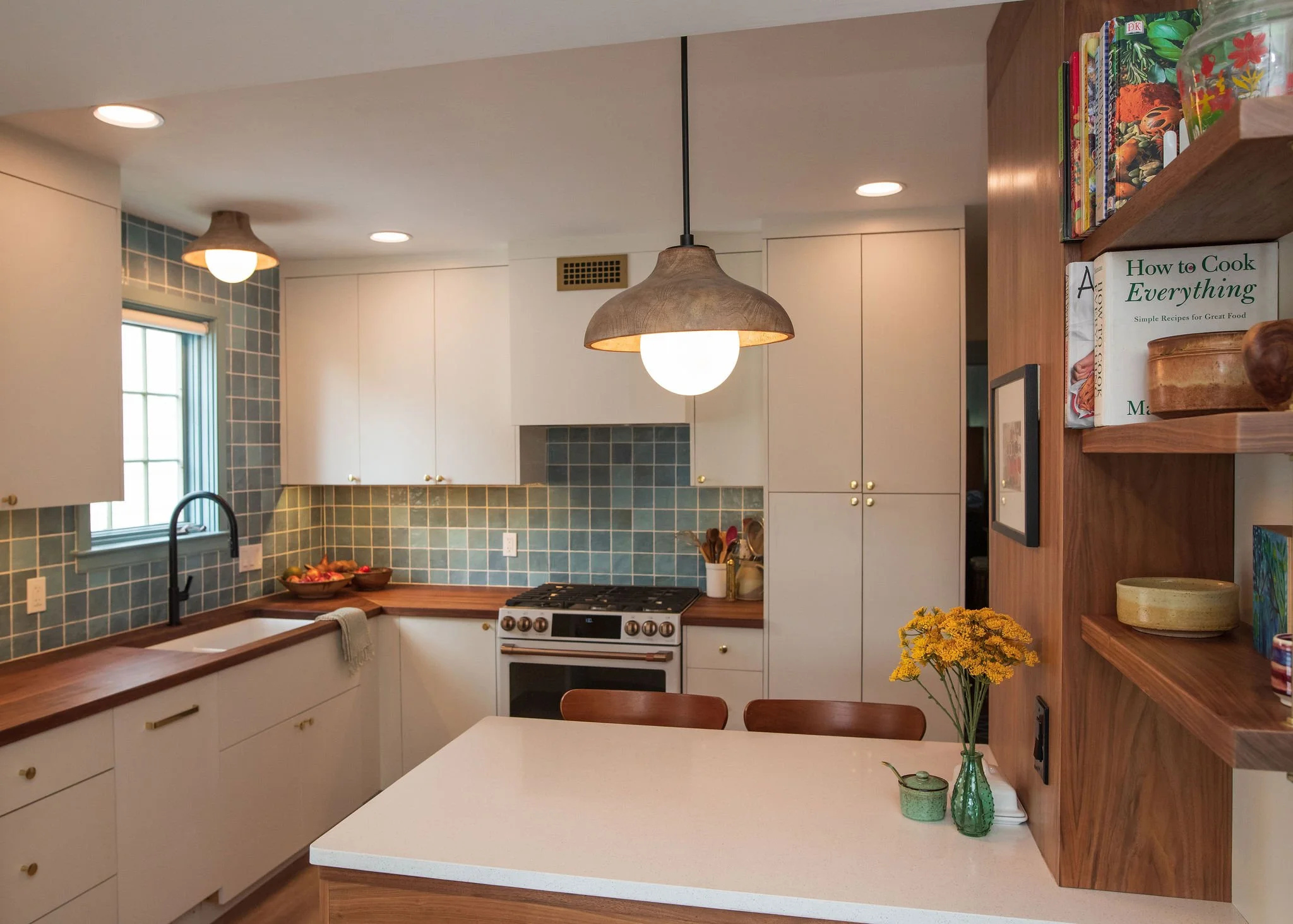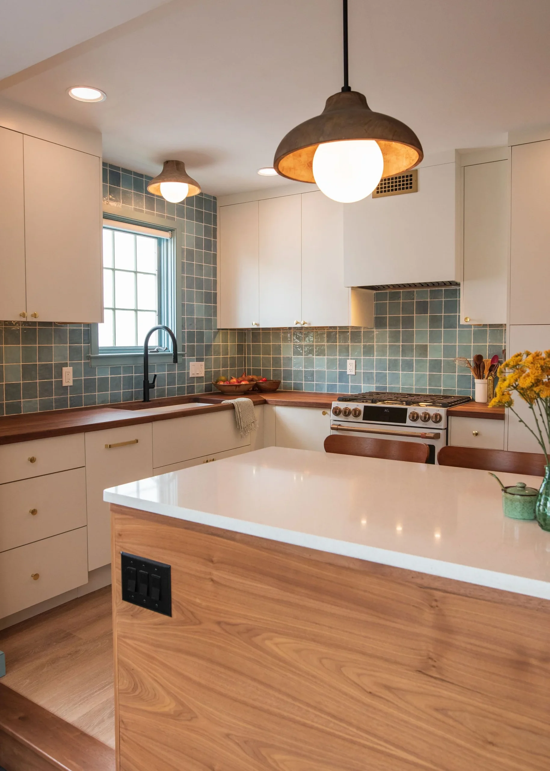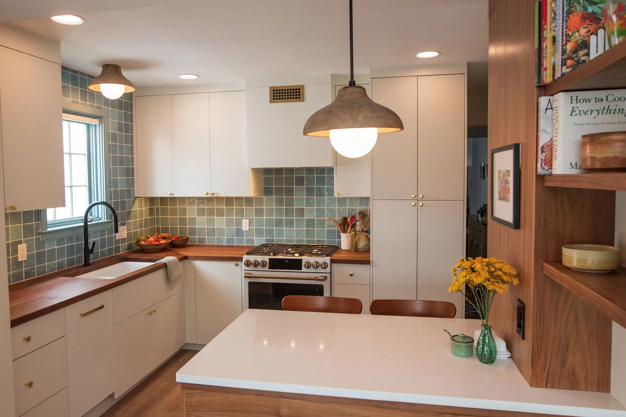 Emeline designed this Doylestown kitchen with a vibrant mid-century modern aesthetic that reflects the homeowner’s love of color and desire for a more open, functional space. A rich teal tile serves as a bold focal point, balanced by the warmth of solid walnut countertops that bring depth and natural texture to the room.