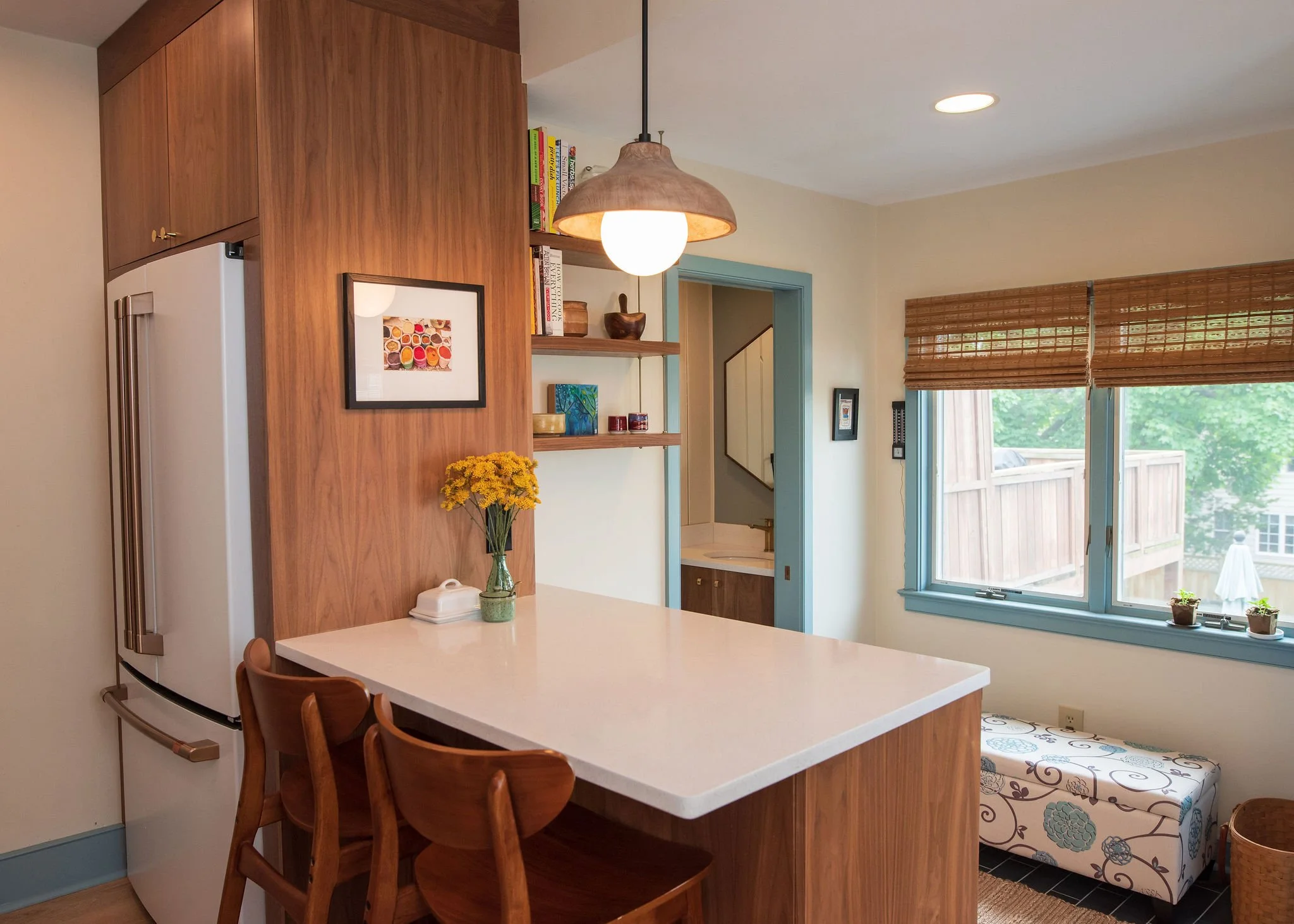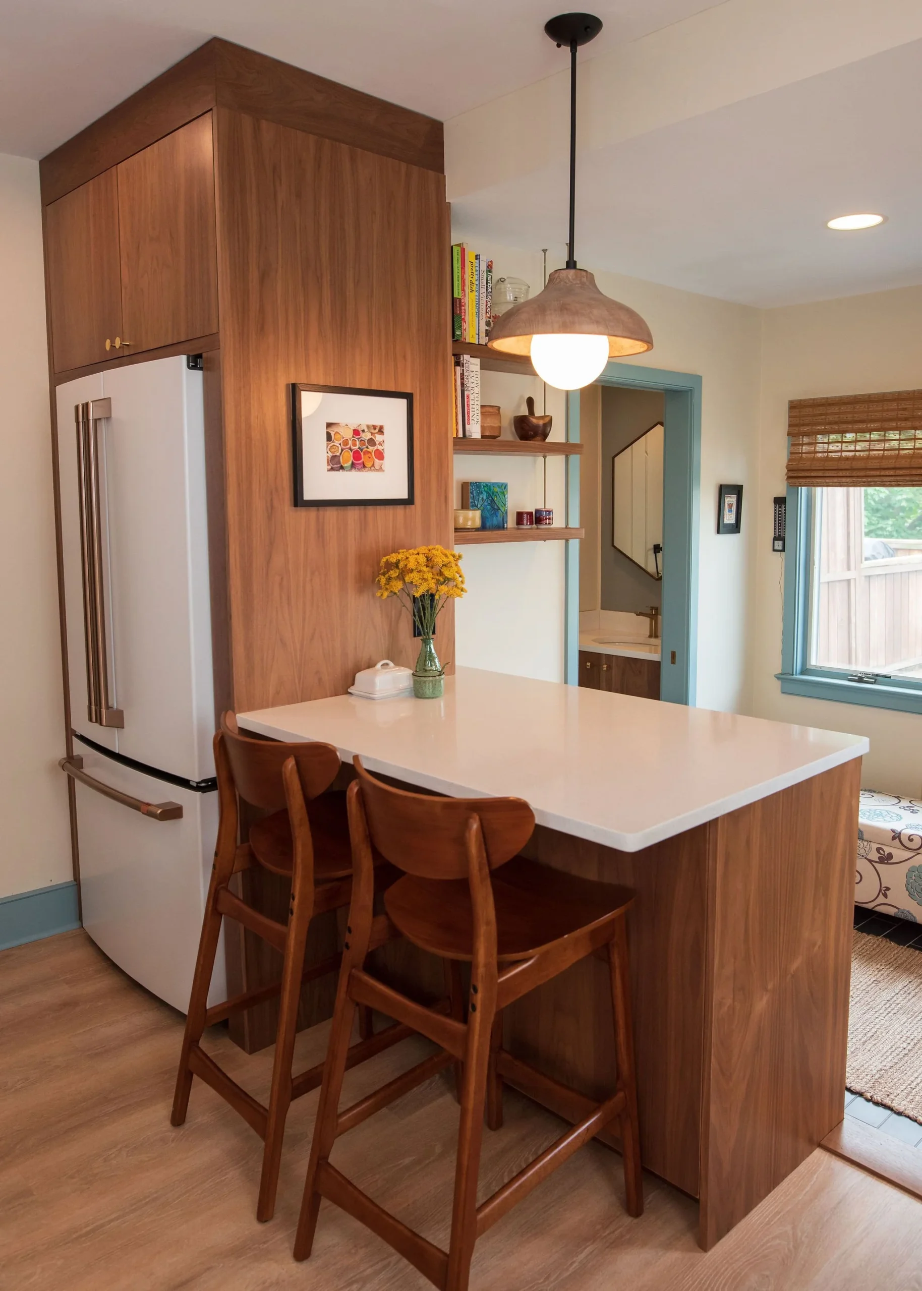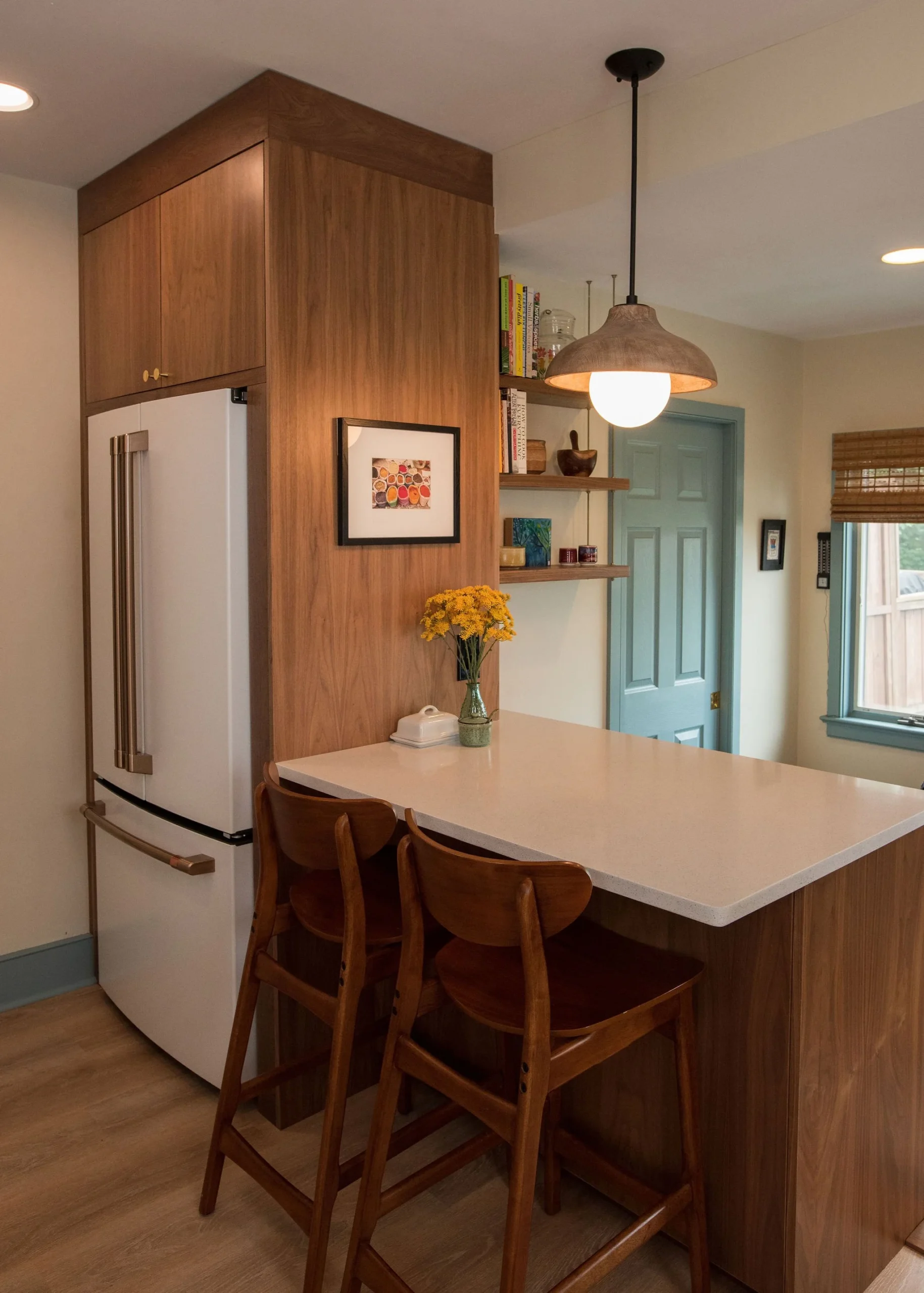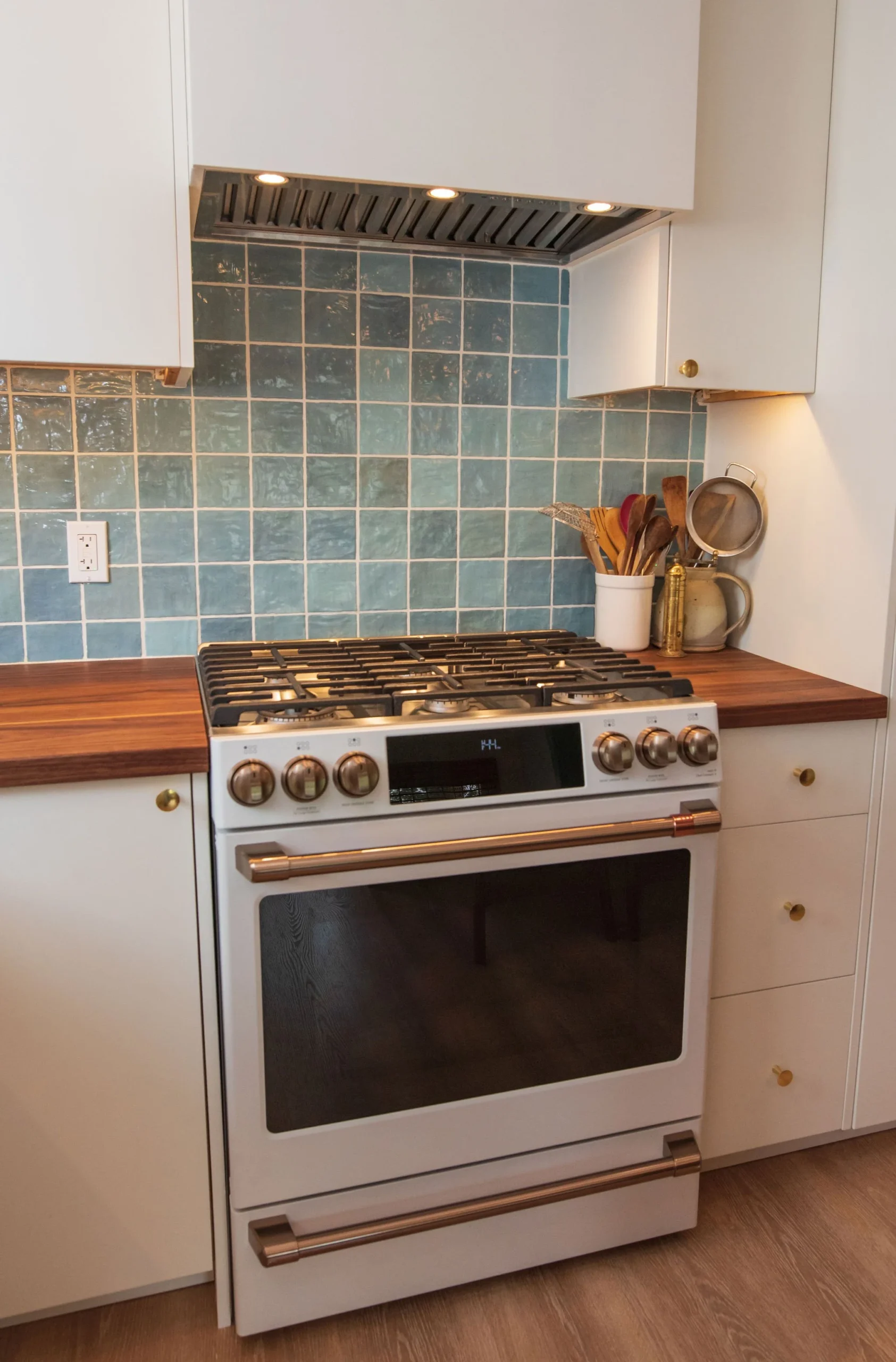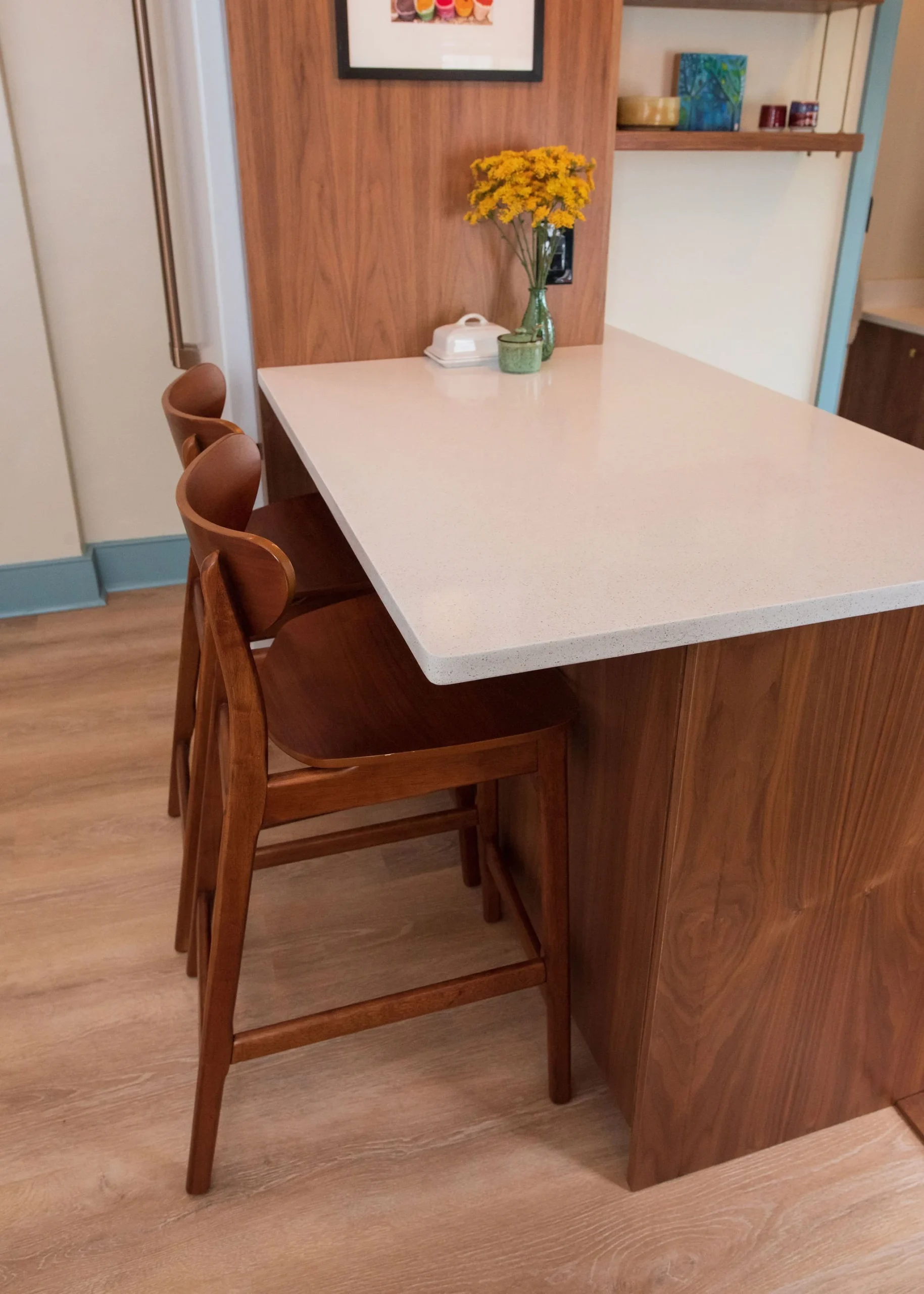 Emeline designed this Doylestown kitchen with a vibrant mid-century modern aesthetic that reflects the homeowner’s love of color and desire for a more open, functional space. A rich teal tile serves as a bold focal point, balanced by the warmth of solid walnut countertops that bring depth and natural texture to the room.