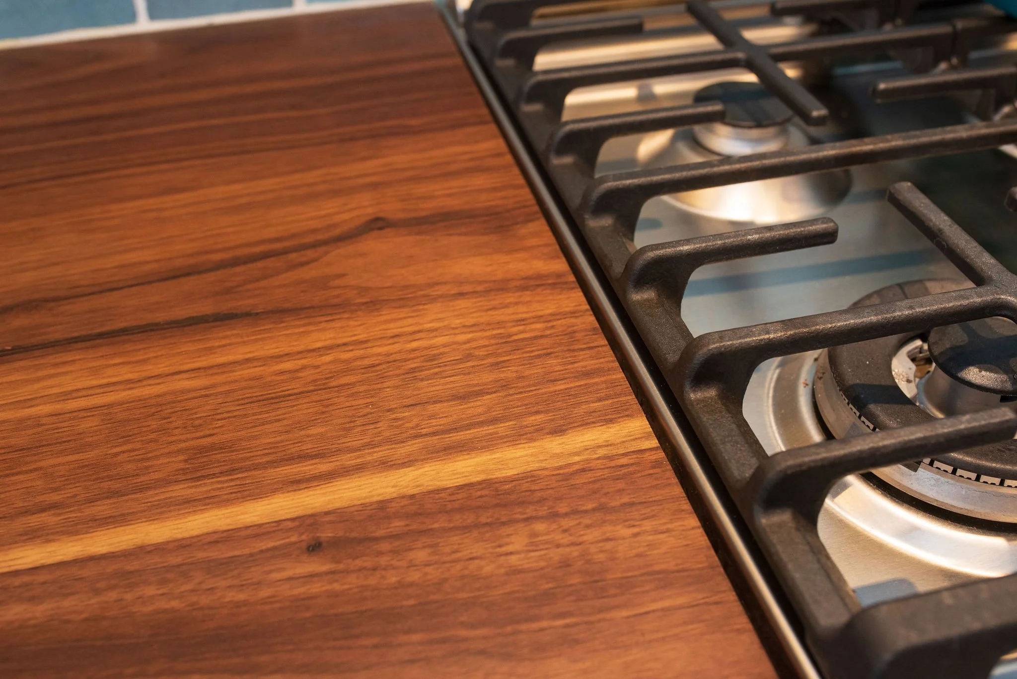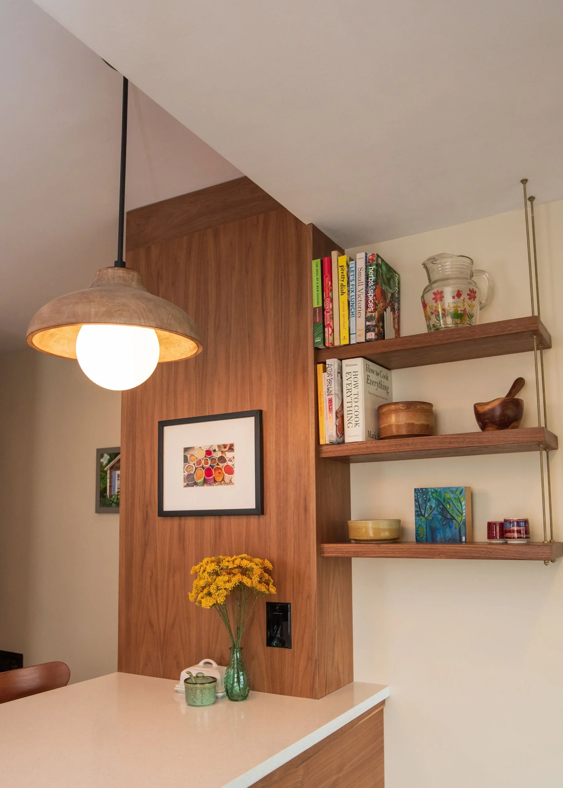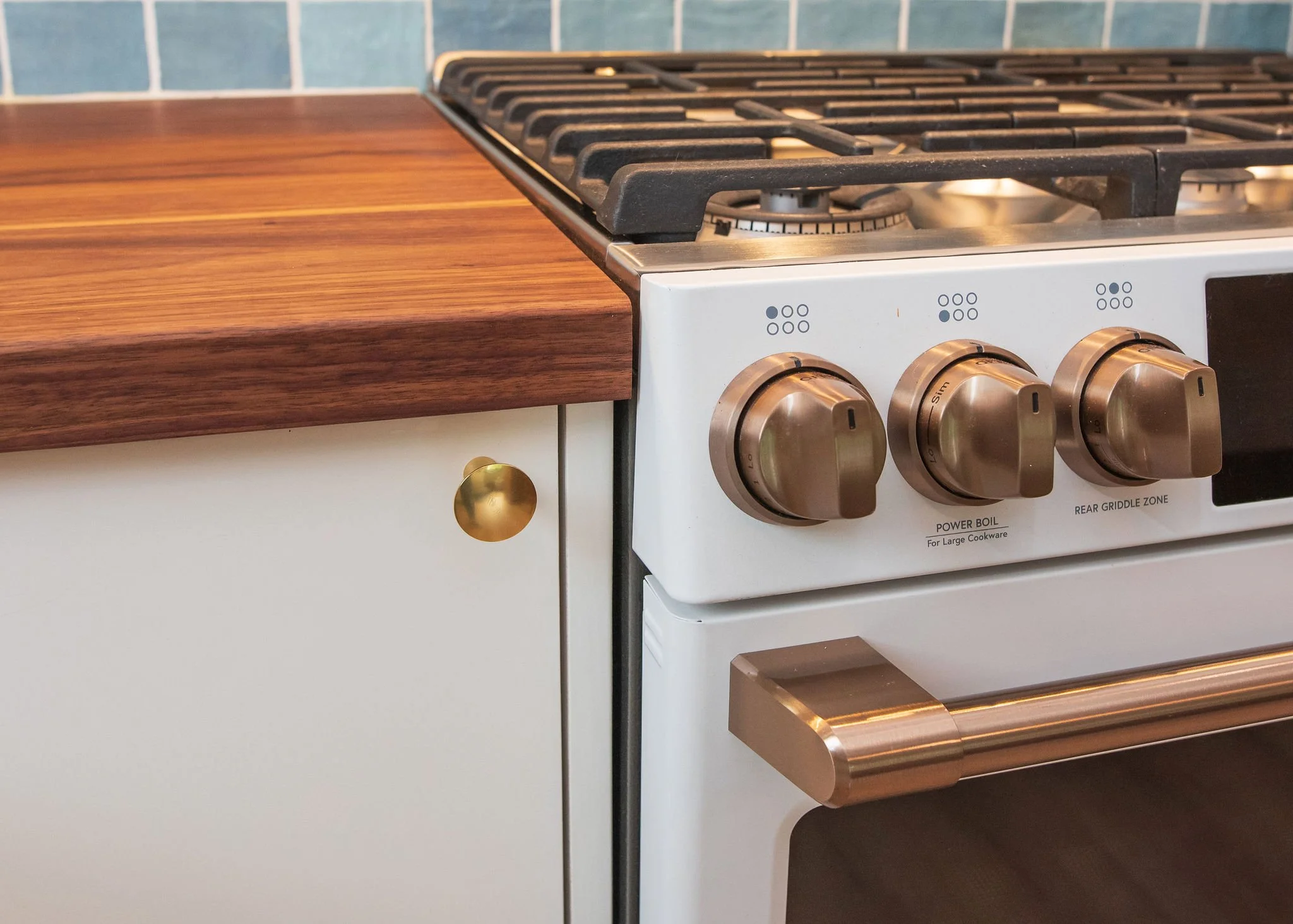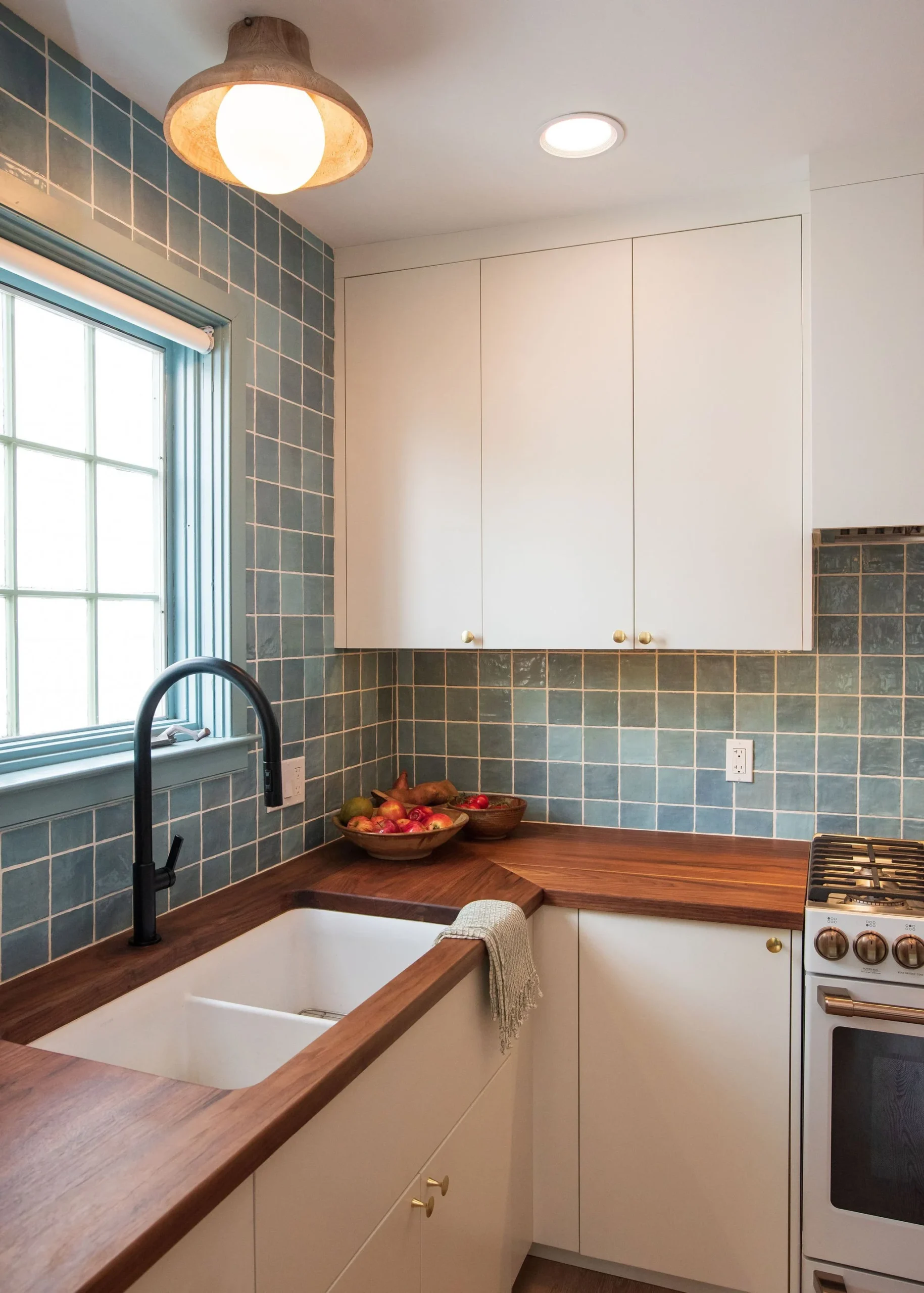 The walnut countertops became the defining feature of the space. Finished with a hand-rubbed blend of tung oil and beeswax, they offer a soft luster and bespoke character that pairs beautifully with the cool tones of the teal tile and crisp white cabinetry. The peninsula continues this balance, featuring a clean white quartz surface framed by walnut cabinetry and open shelving—combining utility with intentional design.