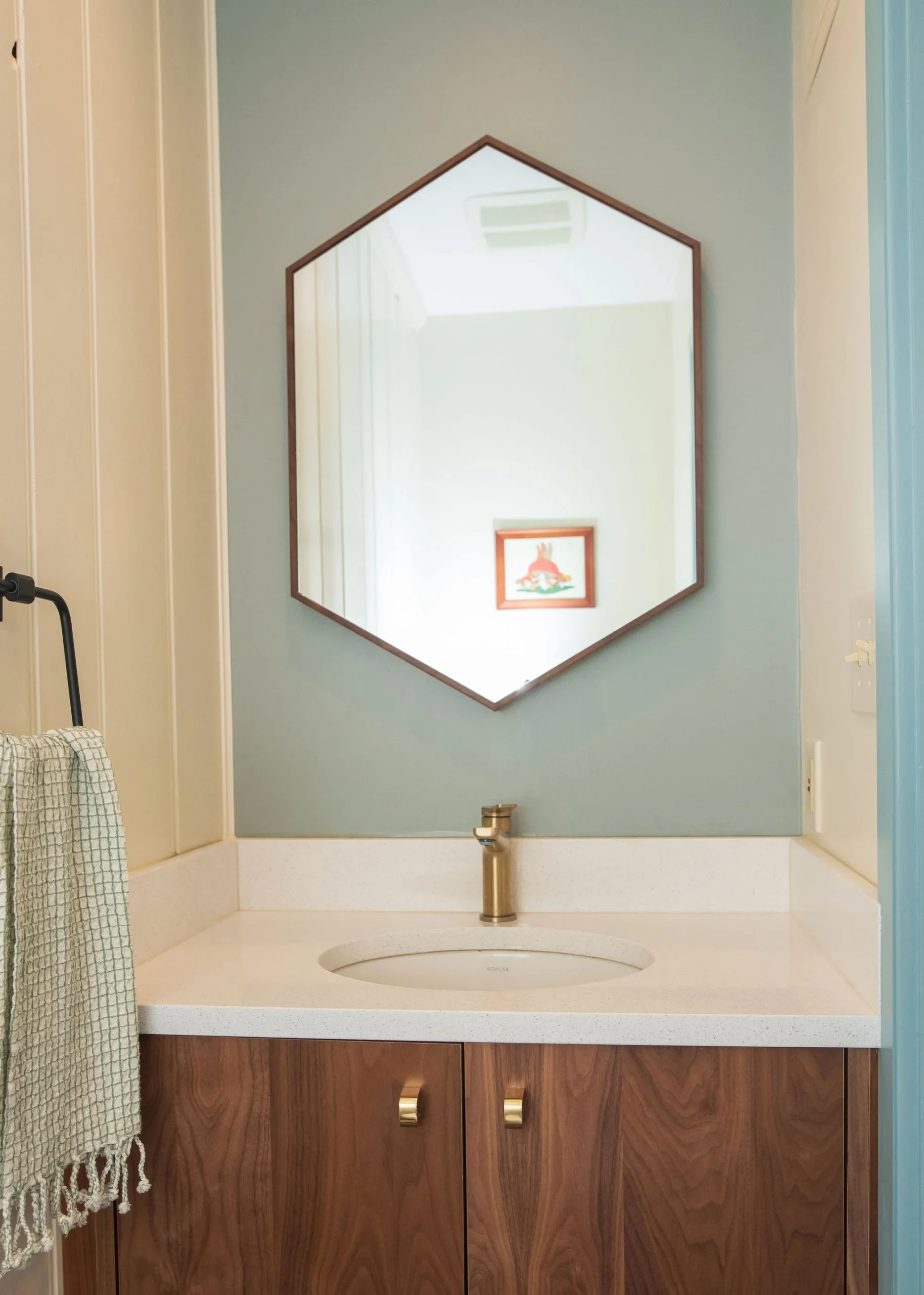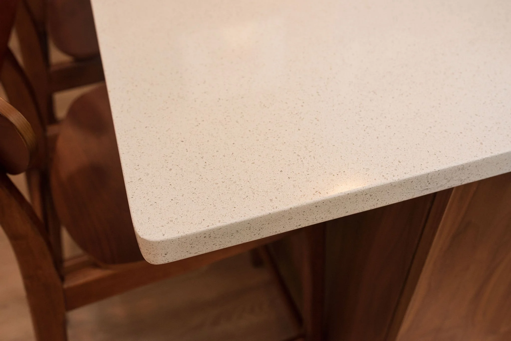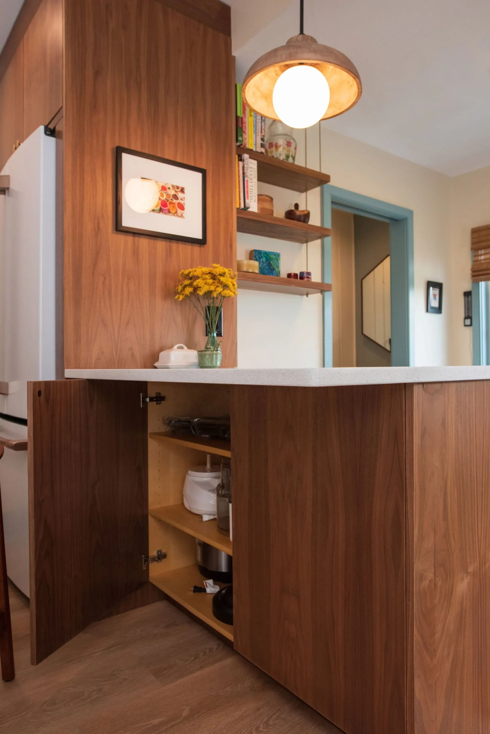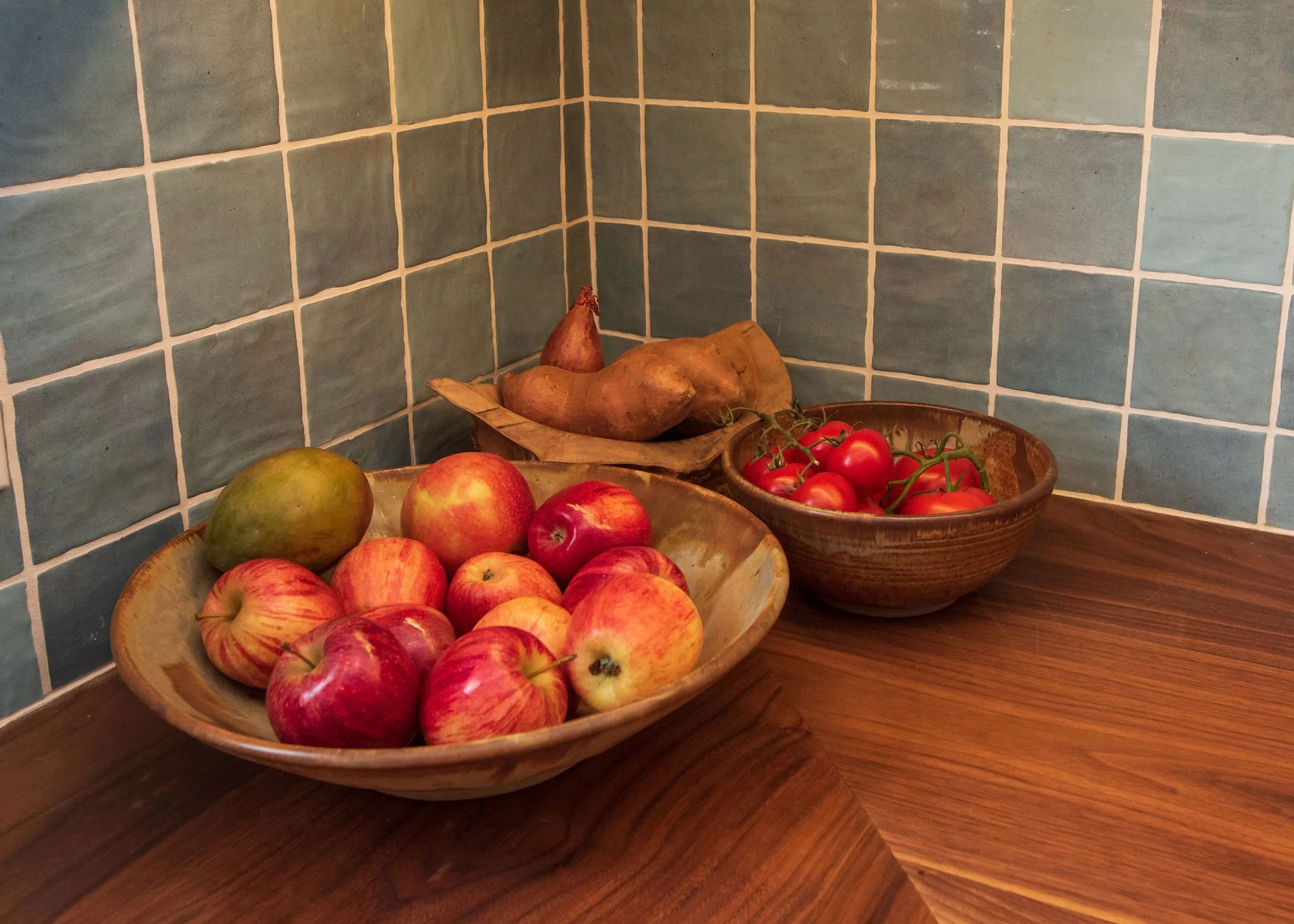 The walnut countertops became the defining feature of the space. Finished with a hand-rubbed blend of tung oil and beeswax, they offer a soft luster and bespoke character that pairs beautifully with the cool tones of the teal tile and crisp white cabinetry. The peninsula continues this balance, featuring a clean white quartz surface framed by walnut cabinetry and open shelving—combining utility with intentional design.